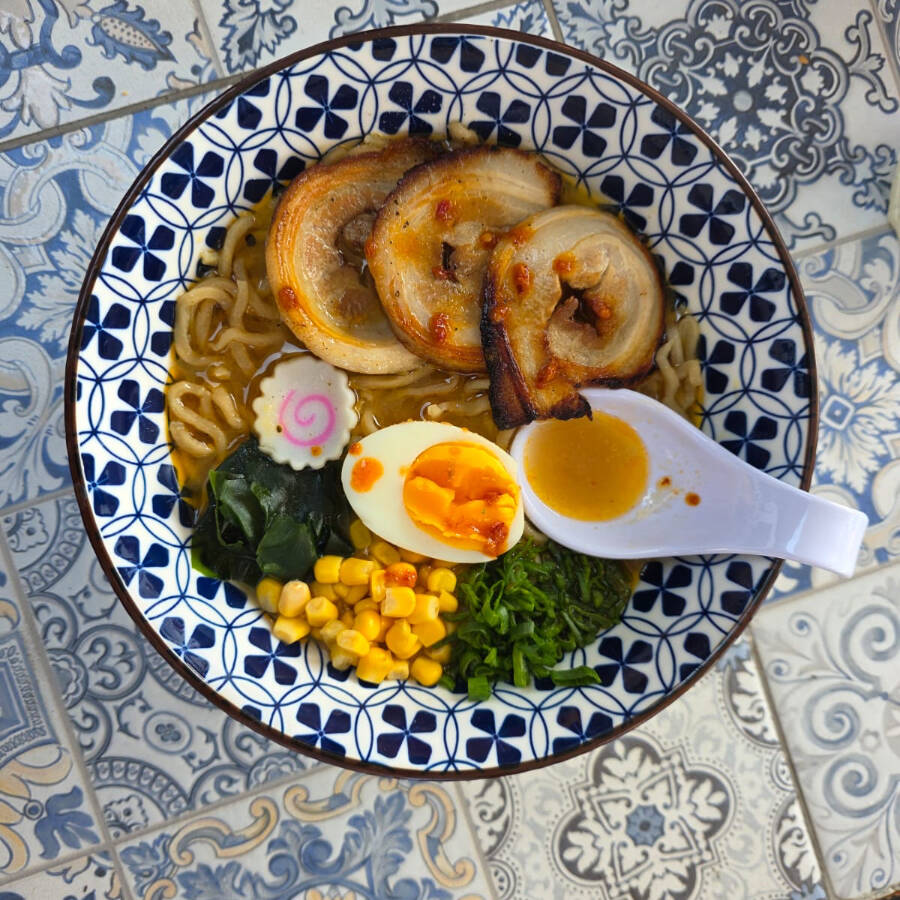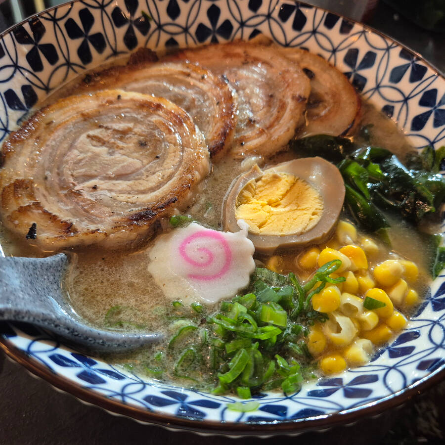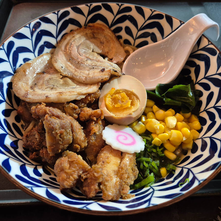 Ramen a base de cerdo, fideos caseros, pollo frito karaage, mix de verduras, huevo marinado y naruto