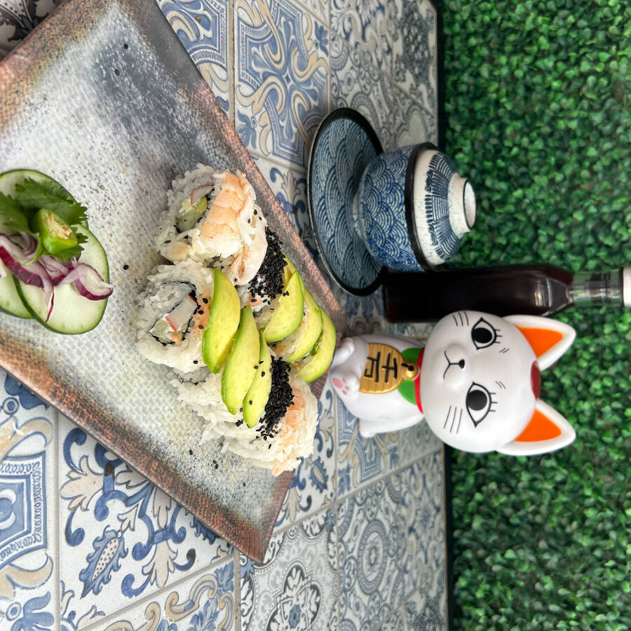 Roll clásico relleno de surimi, aguacate, pepino y Philadelphia, con cubierta de aguacate.