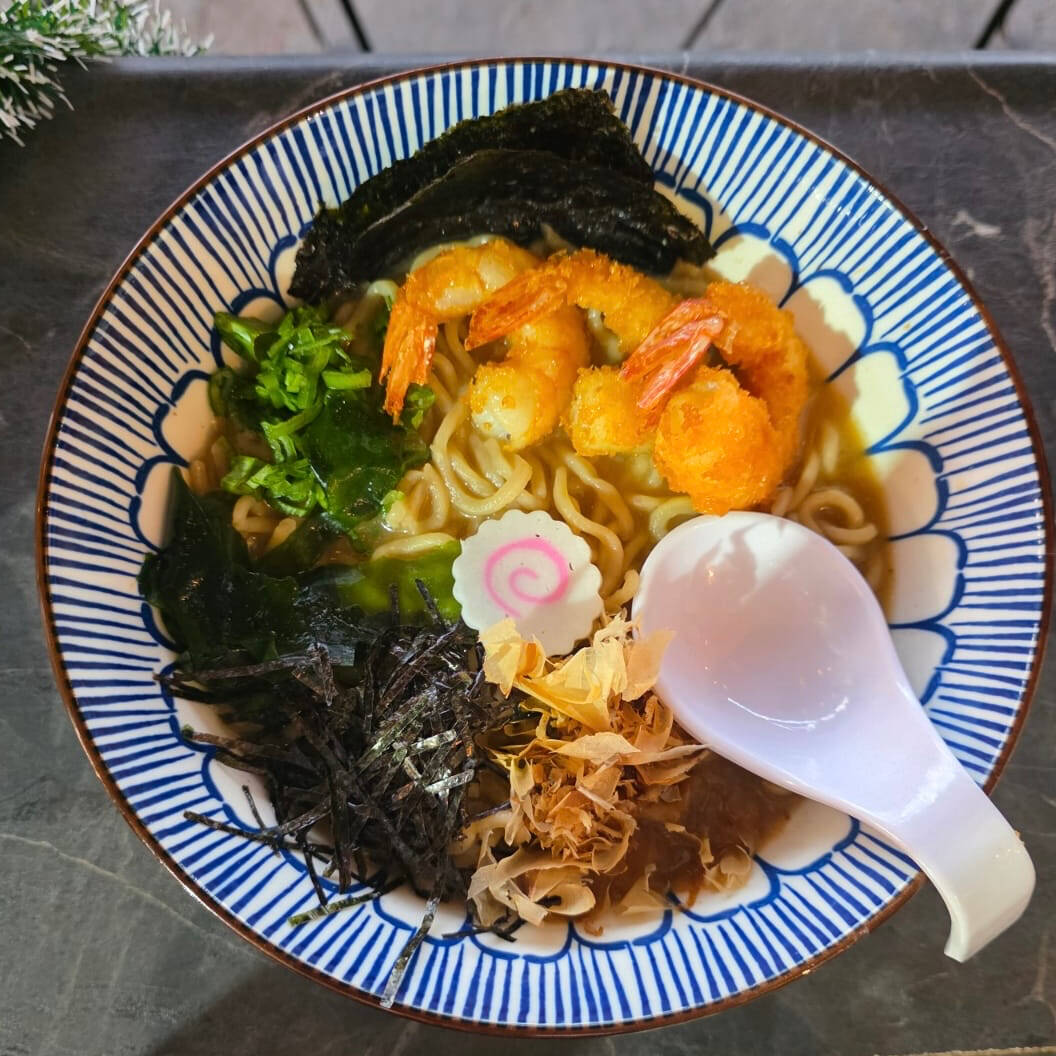 Caldo base de cerdo y miso, acompañado con mix de Nori, katsubushi, naruto y camarón frito Pantoja