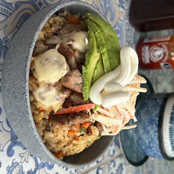 Arroz frito con mix de verduras, cebollín, jugoso chashu (cerdo), con aguacate y Philadelphia.