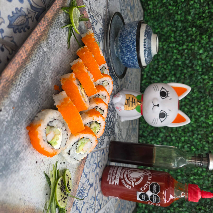 Rolló clásico con relleno de surimi. Y forrado por arriba con salmón, atún, pulpo, aguacate, camaron y masaggo
