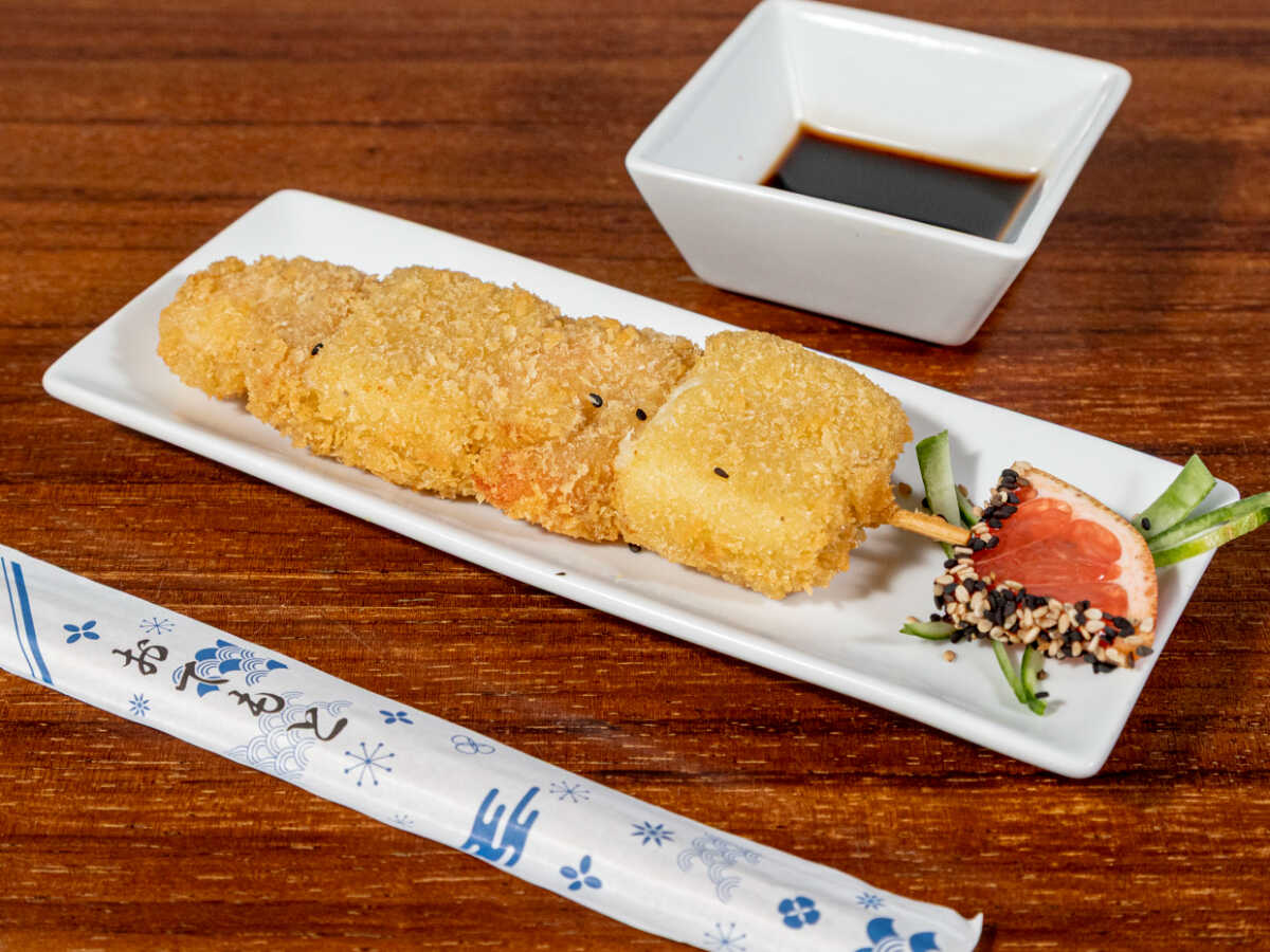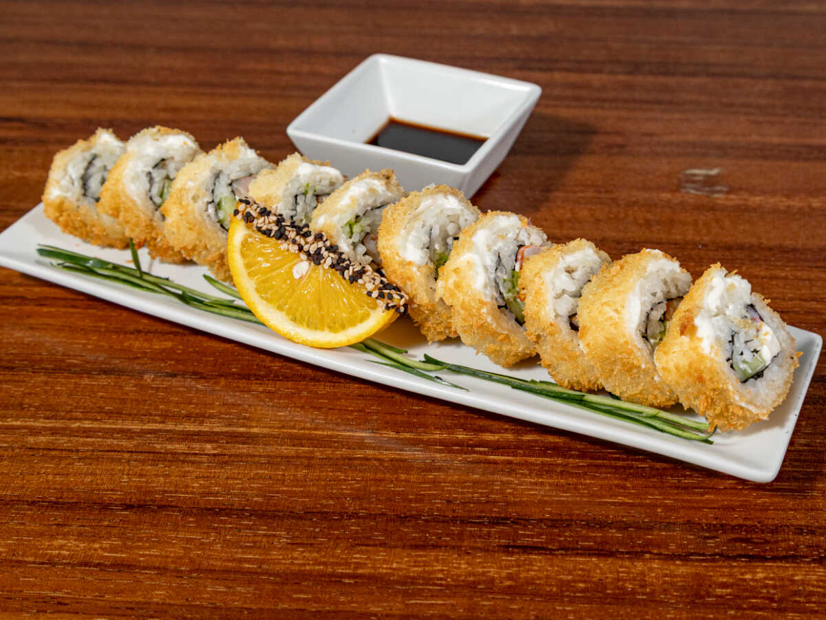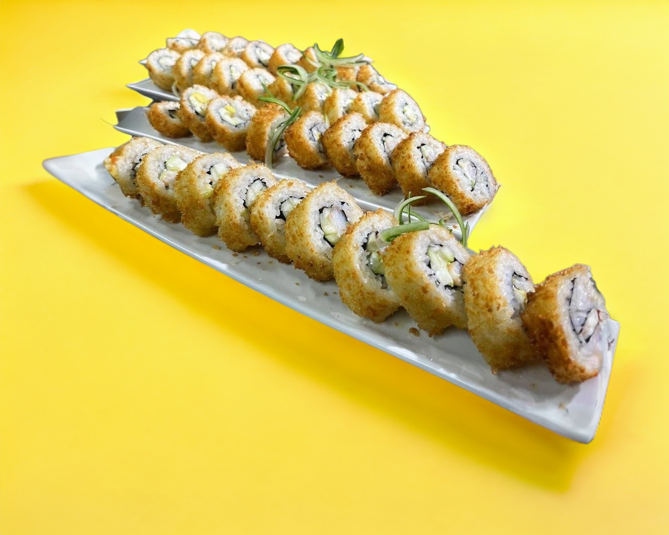rollo cubierto de philadelphia y empanizado, relleno de pepino, aguacate y proteína a elección