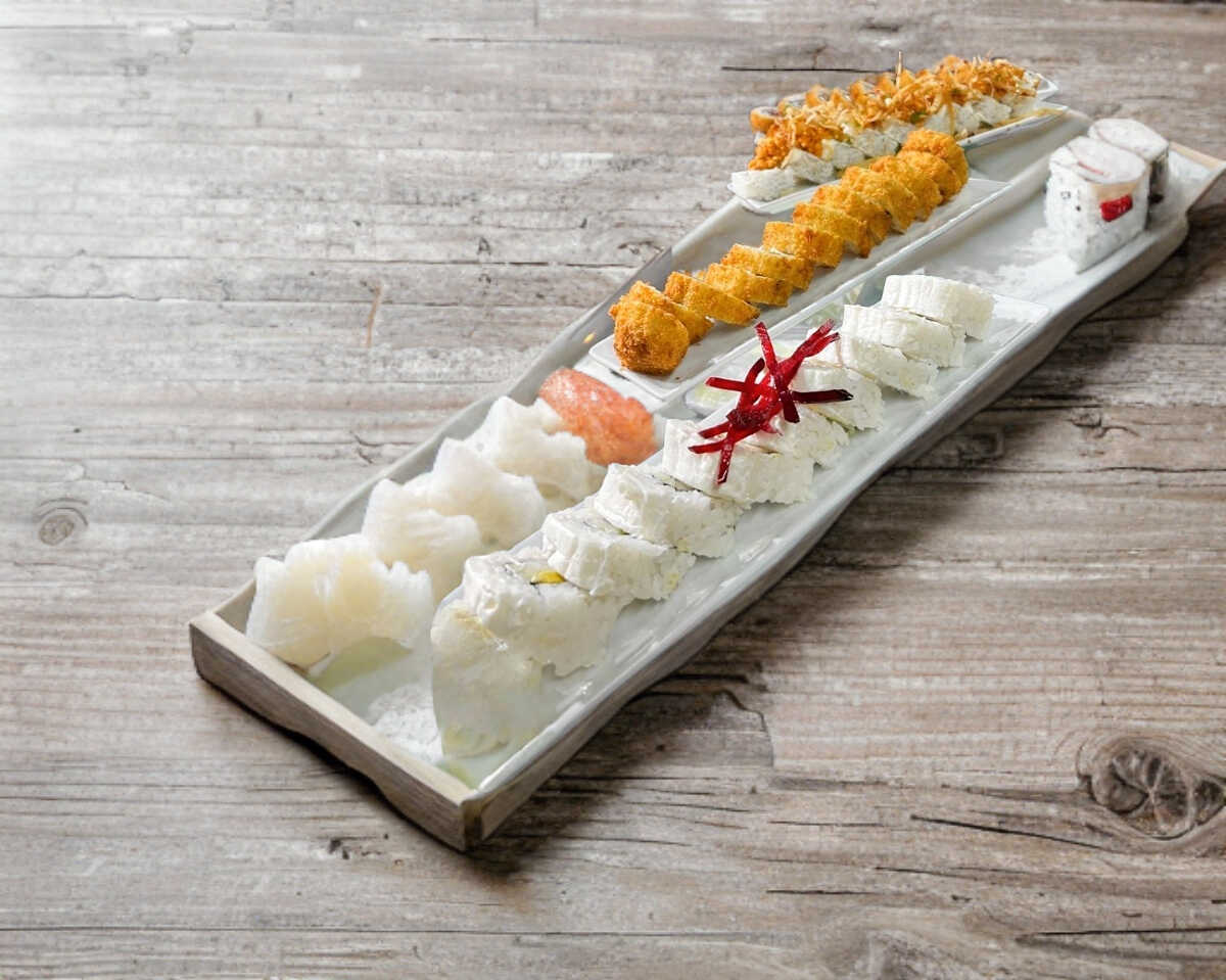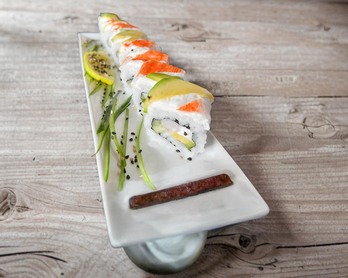 rollo vegetariano cubierto de surimi, aguacate y philadelphia