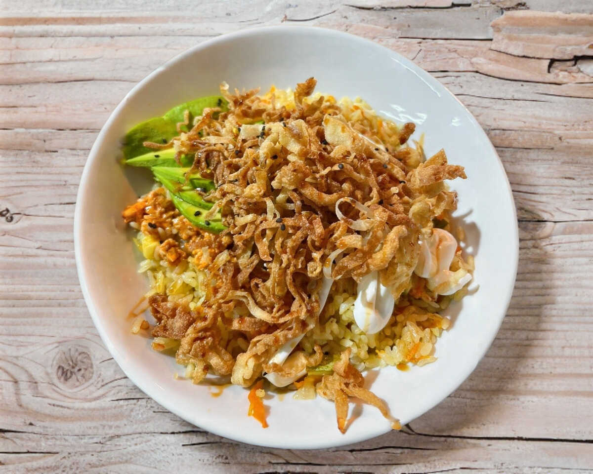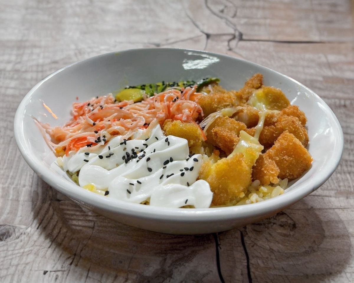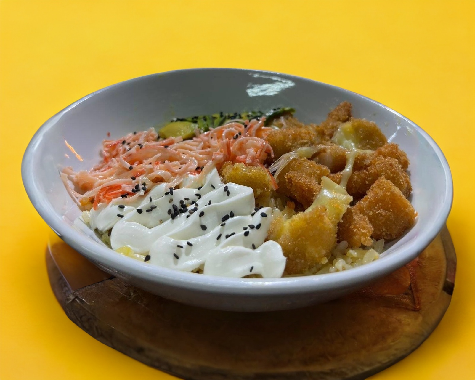 arroz con ensalada de cangrejo, camarones empanizados y manchego bañado en salsa anguila