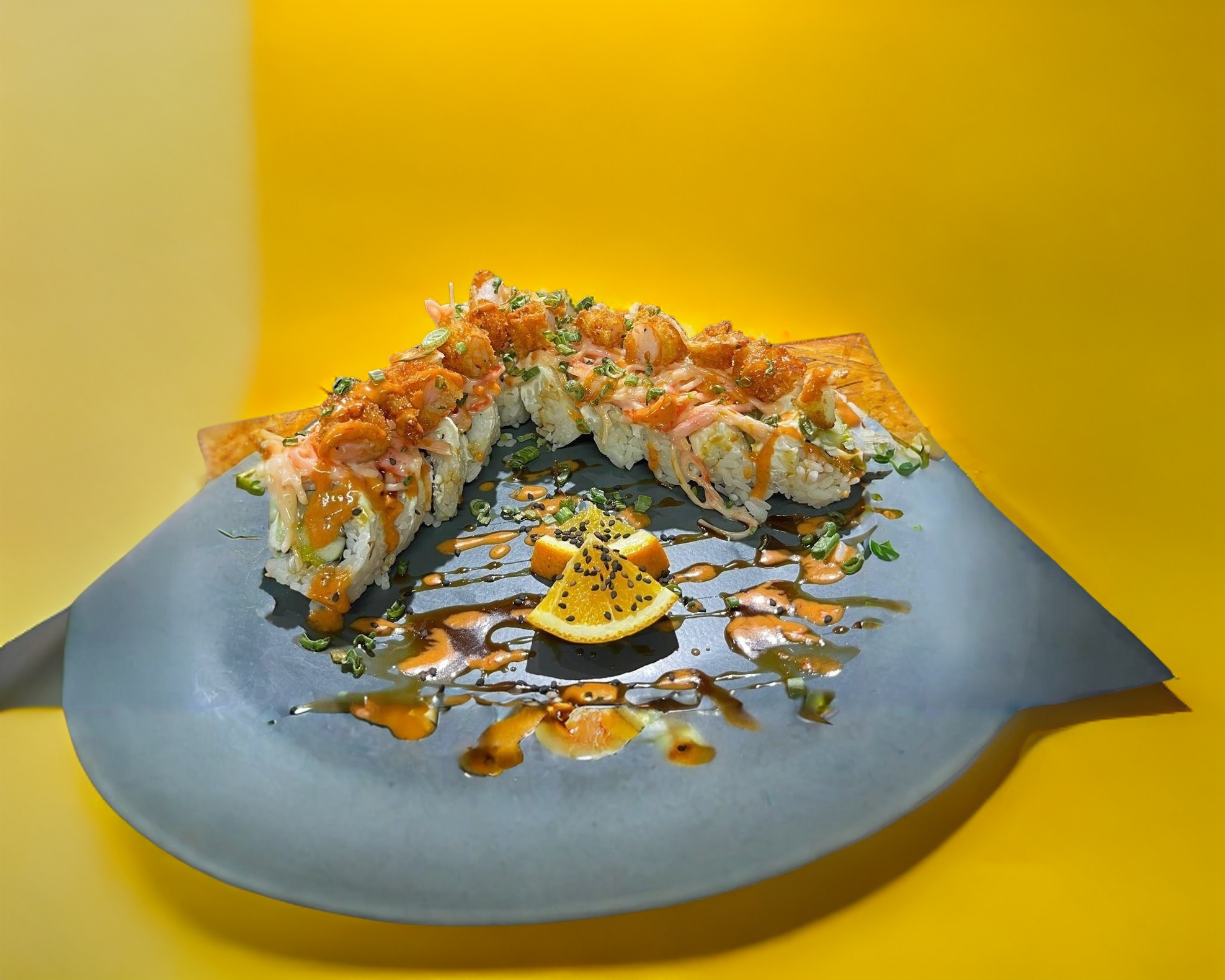 Rollo relleno de fhiladelphia,pepino y aguacate coronado con ensalada de cangrejo ,camarón empanizado y queso manchego bañado en salsa de anguila y chipotle