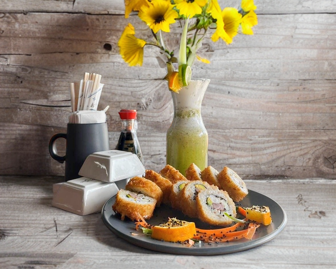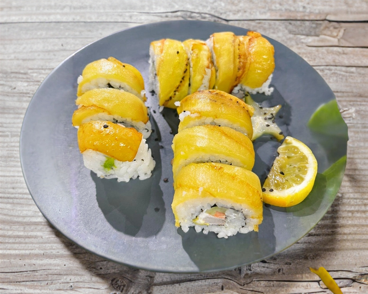 rollo cubierto de plátano frito relleno de philadelphia, pepino, aguacate y camarón