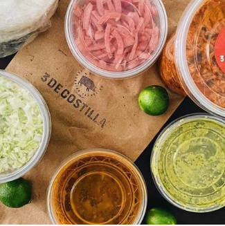 1 L De costilla de puerco, salsa de chipotle, guacamole salseado, cebolla curtida, repollo, tortillas de maíz y limones.