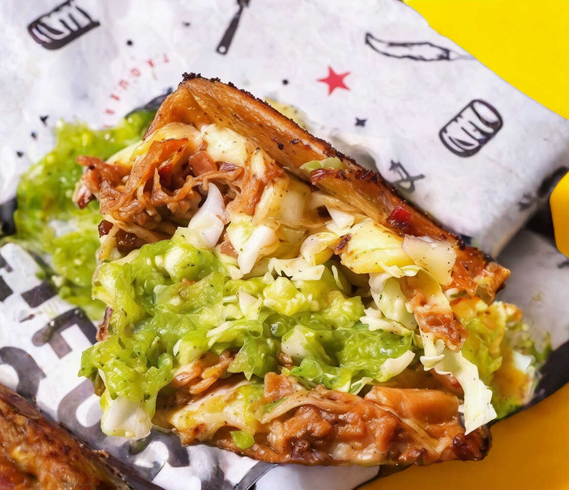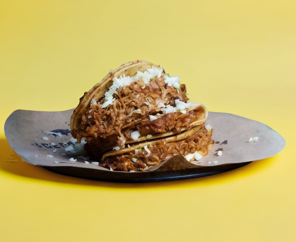 Taco de costilla de puerco con doble tortilla de maíz dorado con queso chihuahua.