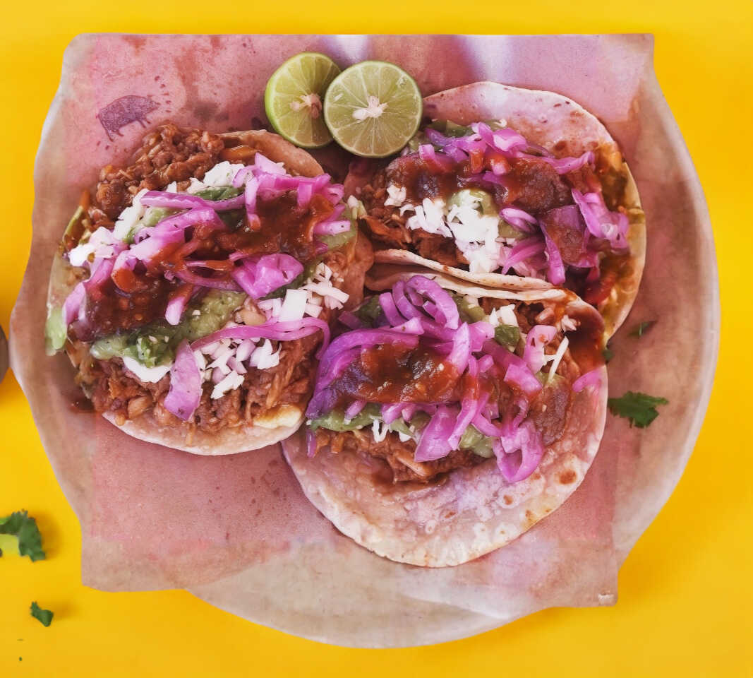 Taco de costilla de puerco con doble tortilla de maíz dorado.