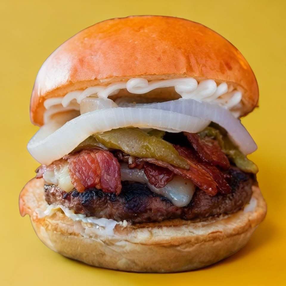Con tocino, cebolla, queso, chile verde asado, mayonesa y mostaza. No incluye papas y bebida.