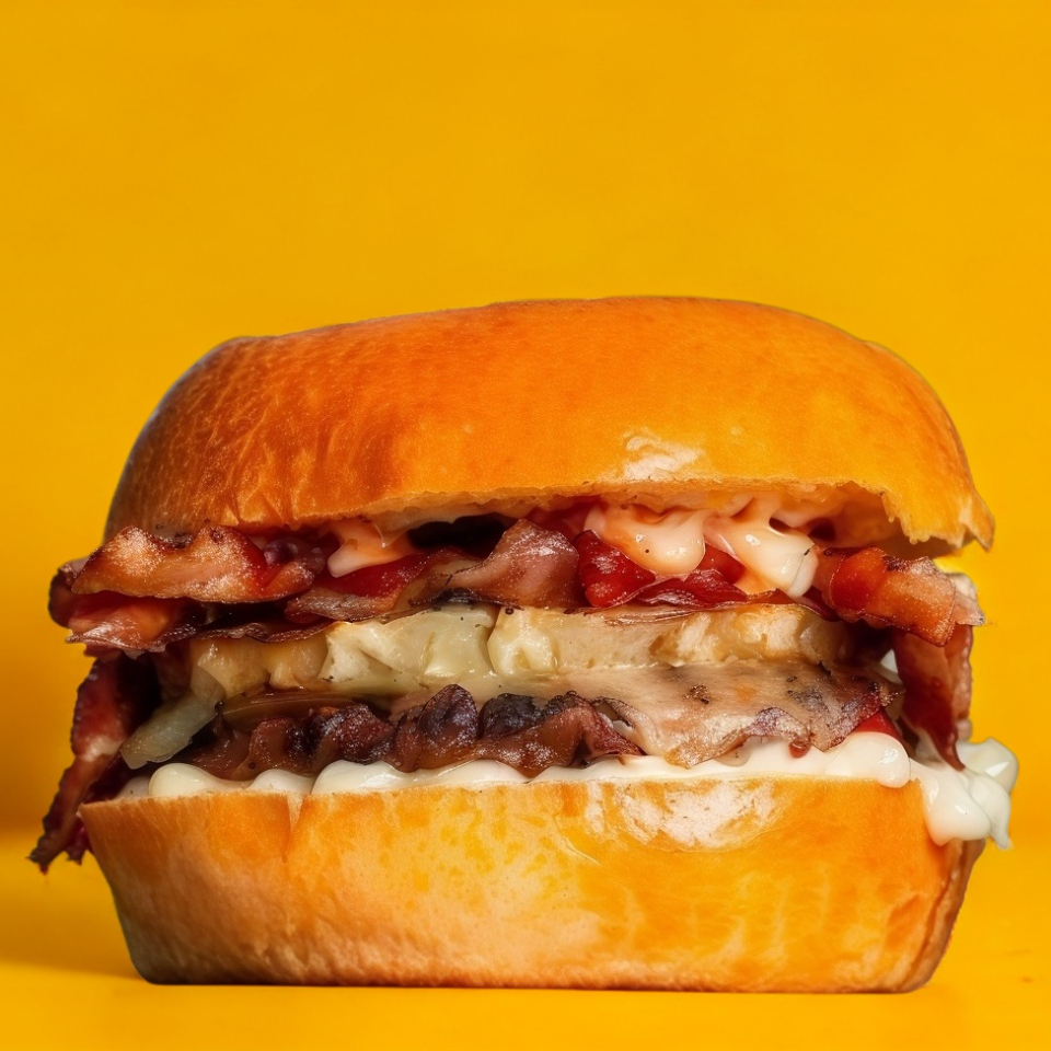 Con tocino, aros de cebolla, salsa BBQ, queso, mayonesa y mostaza. Elige entre diezmillo o pollo a la parrilla. No incluye papas y bebida.