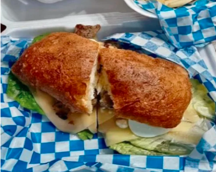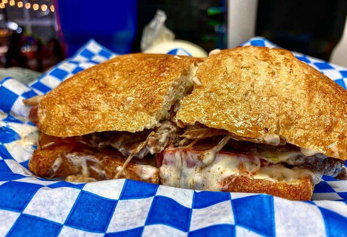 Pan con diezmillo de puerco, huevo, jamón, queso, lechuga, tomate y mayonesa.