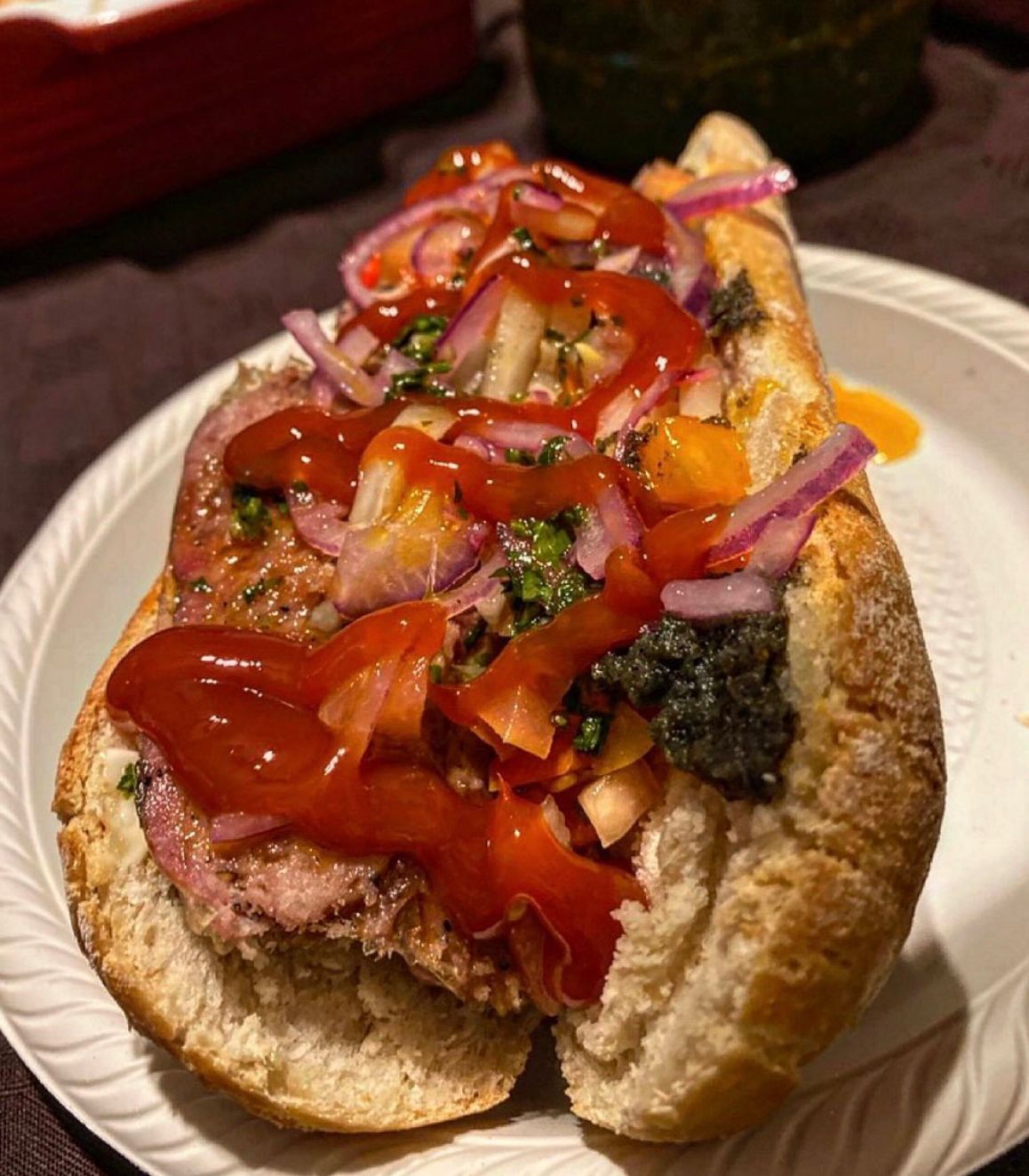Pan con chorizo argentino casero, mayonesa y chimichurri.