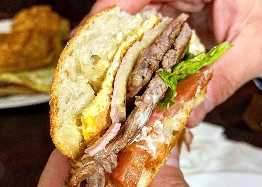 Pan con filete de lomo de res, jamón, queso, tocino, mayonesa, lechuga, tomate y cebolla caramelizada.