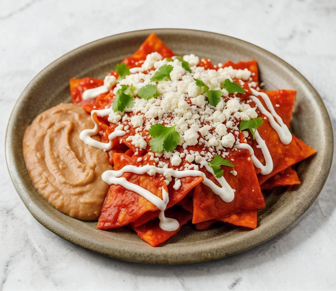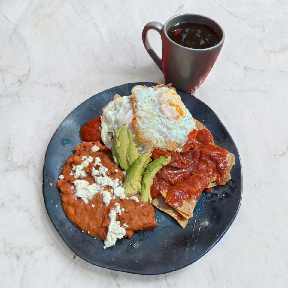 Deliciosos chilaquiles rojos acompañados con frijol, queso fresco, media crema, cebolla morada, cilantro y una porción de aguacate. Acompáñalos con barbacoa o huevo estrellado.