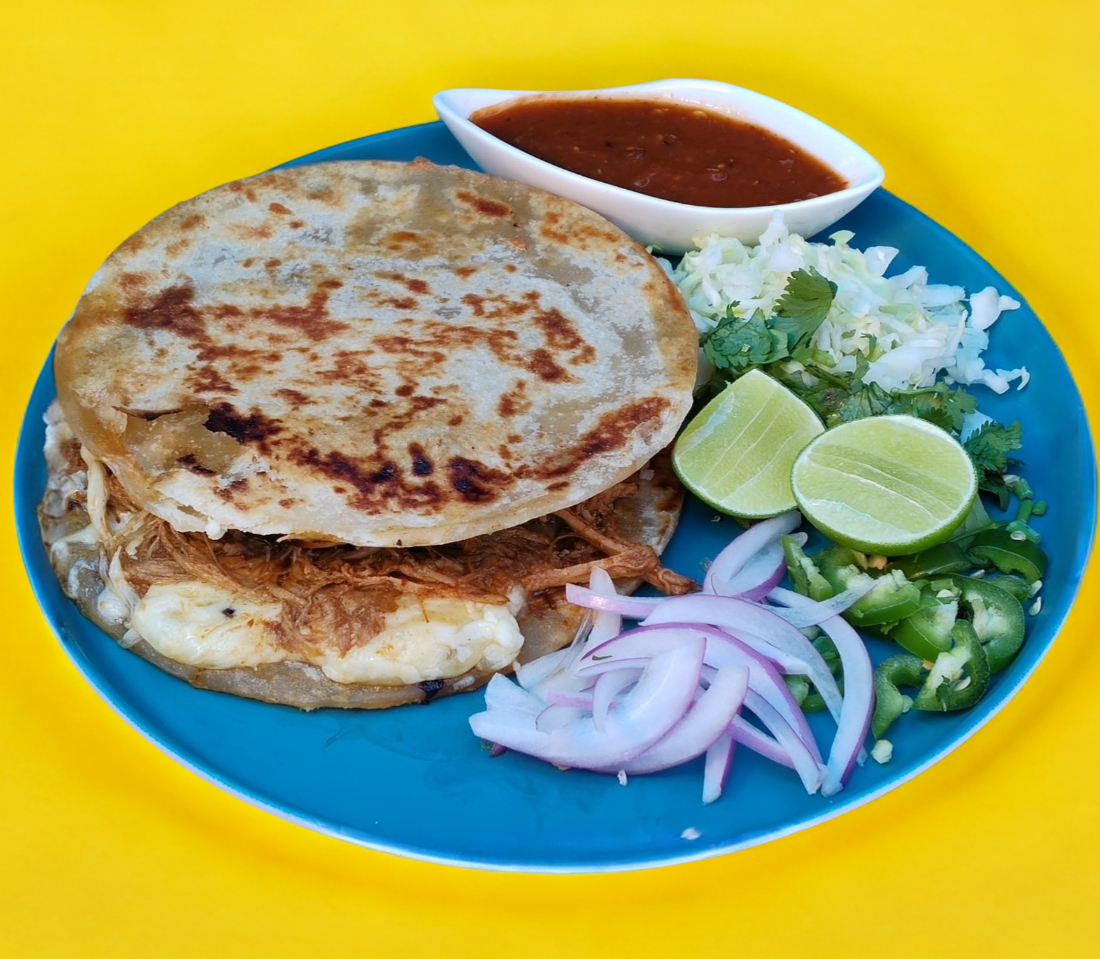 Quesadilla en dos tortillas gorditas de harina con carne de barbacoa. Acompañada de repollo, cebolla morada, cilantro, serrano, limón y salsa de la casa.