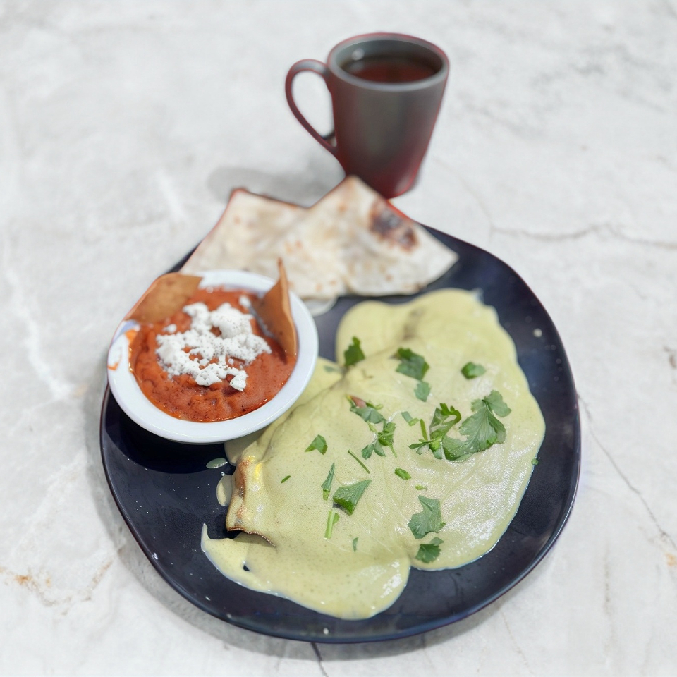 Omelette bañado en crema de chile verde. Lleva tortita de papa, frijoles, queso fresco, porción de aguacate, 3 tortillas de harina o 4 de maíz y salsa de la casa.