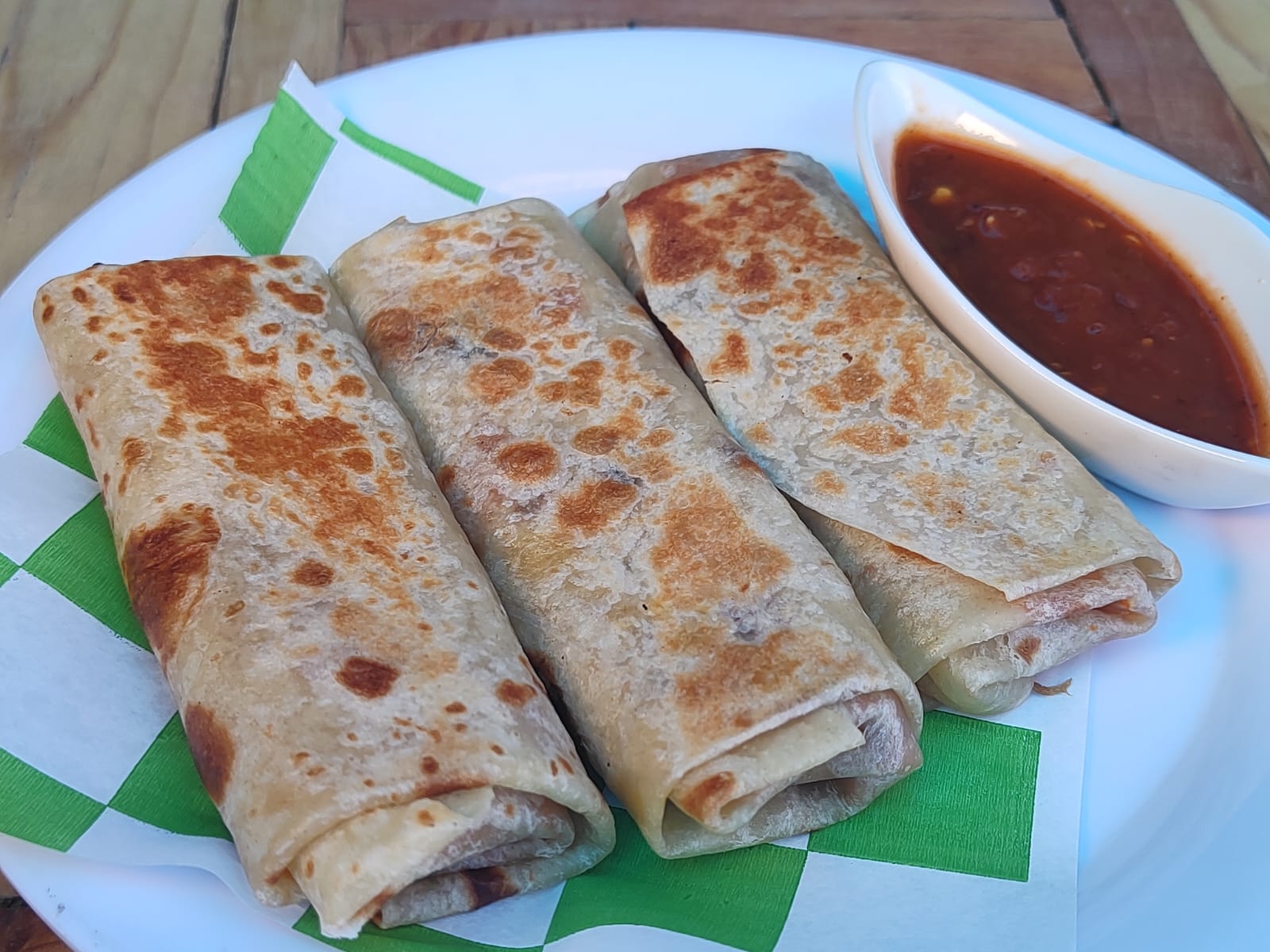 3 burritos de huevo con chorizo, 1 burrito de frijol y salsa de la casa.