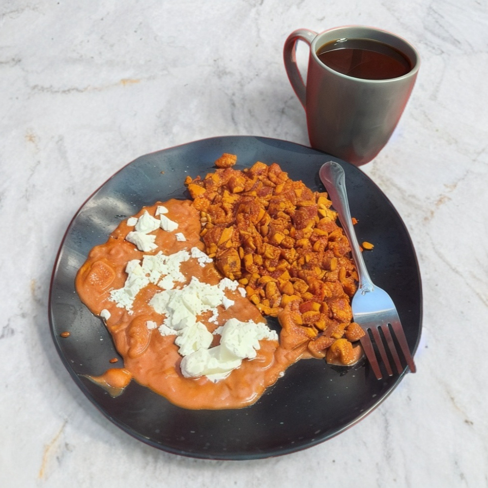 Frijol, queso fresco, aguacate y salsa de la casa.