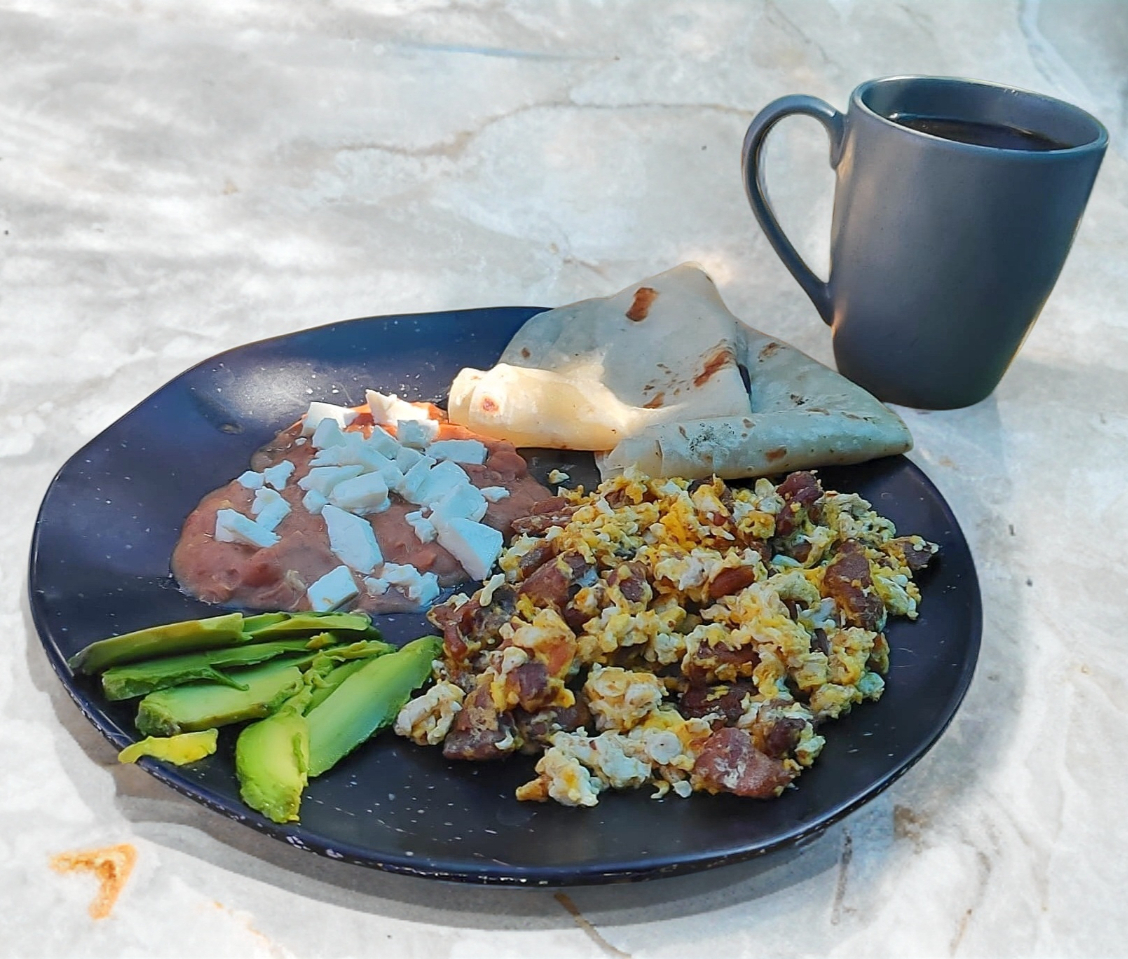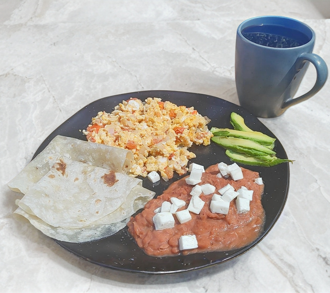 2 huevos revueltos con tomate, cebolla, chile verde, frijoles, queso fresco, porción de aguacate, 3 tortillas de harina o 4 de maíz y salsa de la casa.