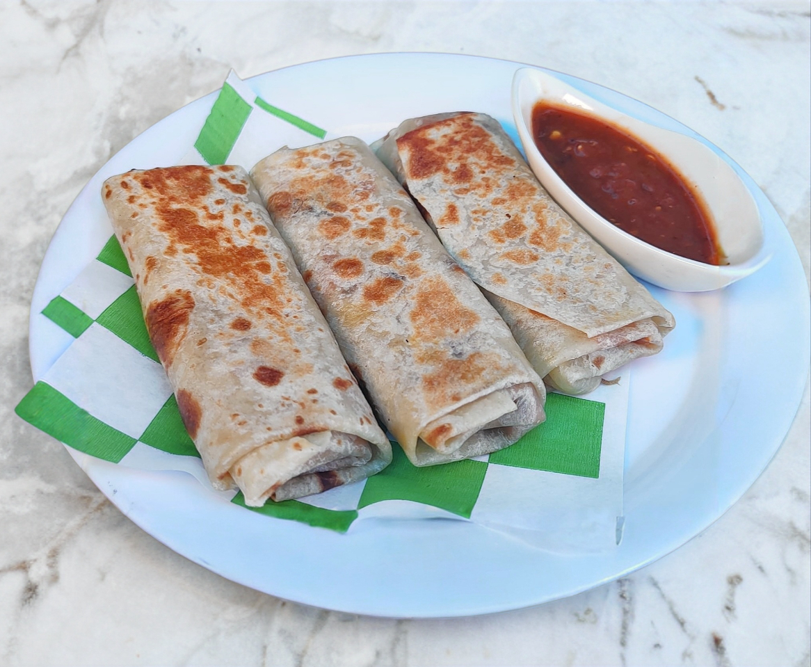 3 burritos de huevo con verdura, 1 burrito de frijol y salsa de la casa.