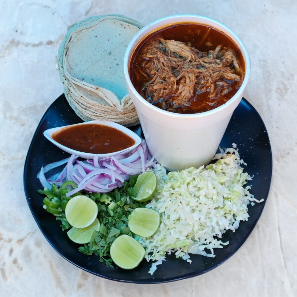 1 Litro de barbacoa, repollo, cebolla morada, serrano, cilantro, tortillas de maíz, salsa, limones.
