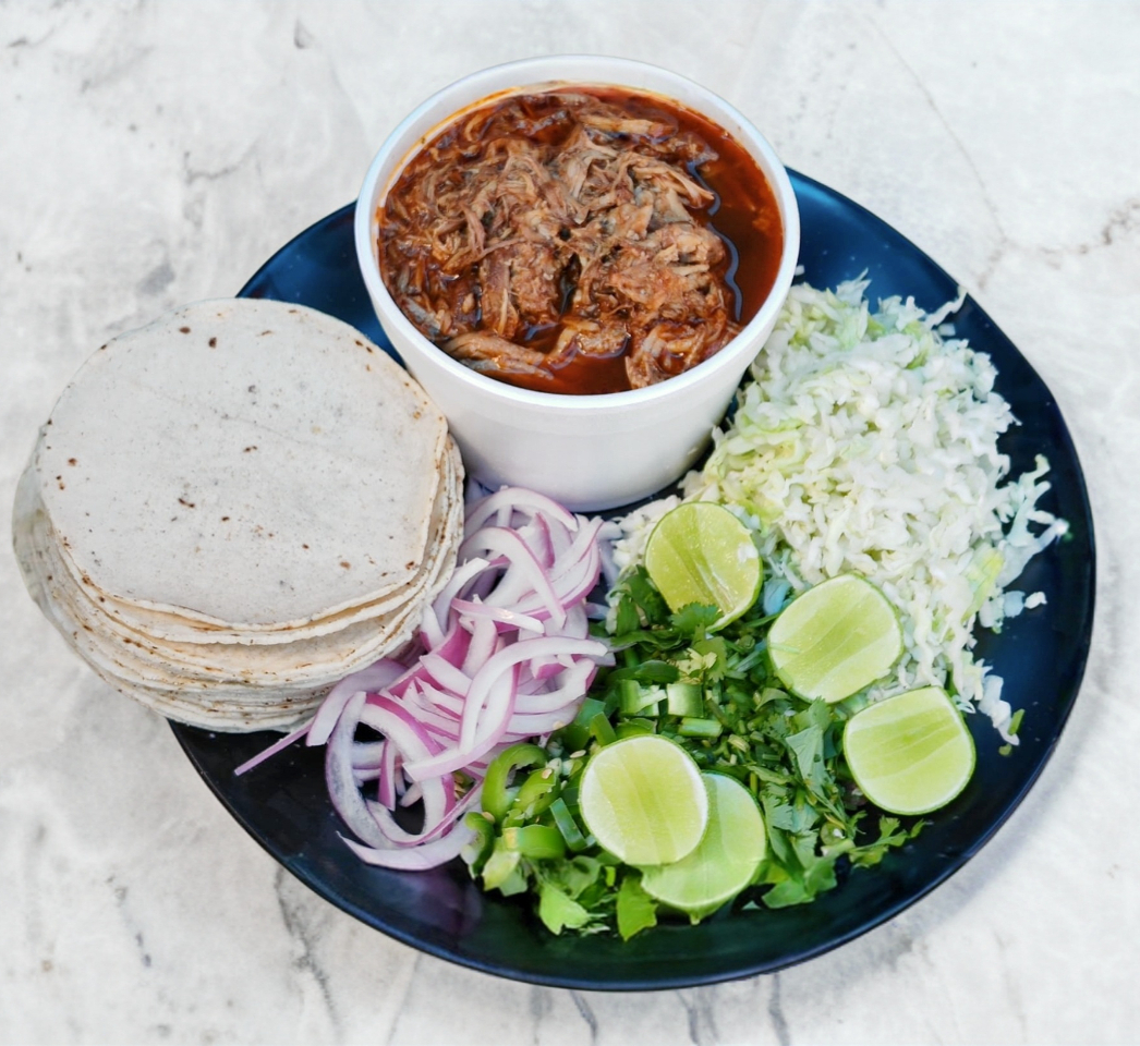 1/2 litro de barbacoa, repollo, cebolla morada, serrano, cilantro, tortillas de maíz, salsa, limones.