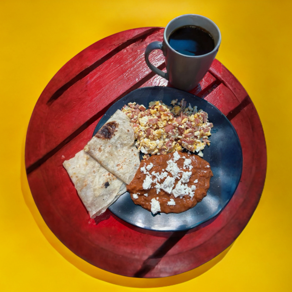 Frijoles, queso fresco, 3 tortillas de harina o 4 de maíz, café 10 oz.