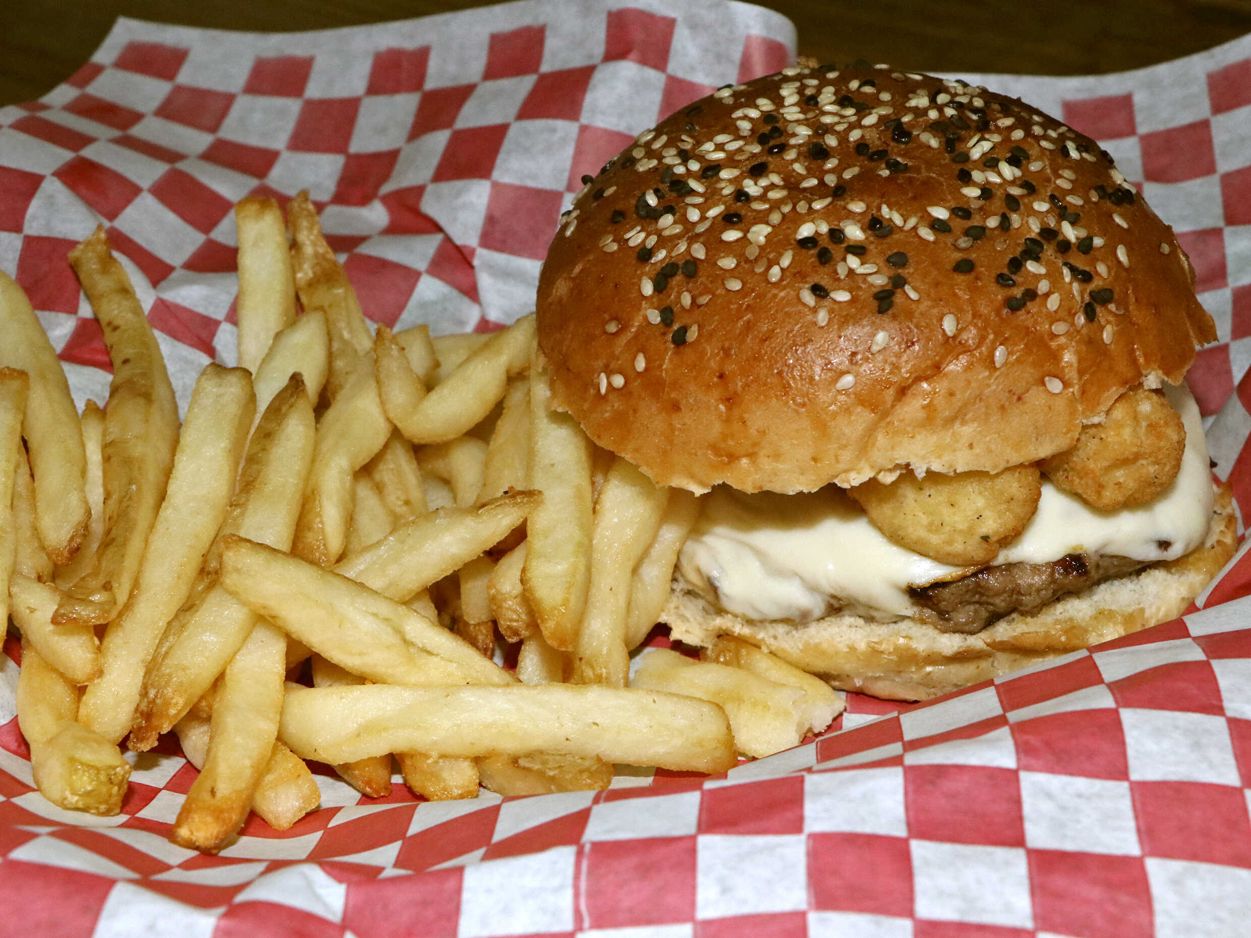 150 g De carne, champiñones, queso mozzarella, cebolla, queso cheddar, lechuga, tomate y papas a la francesa.
