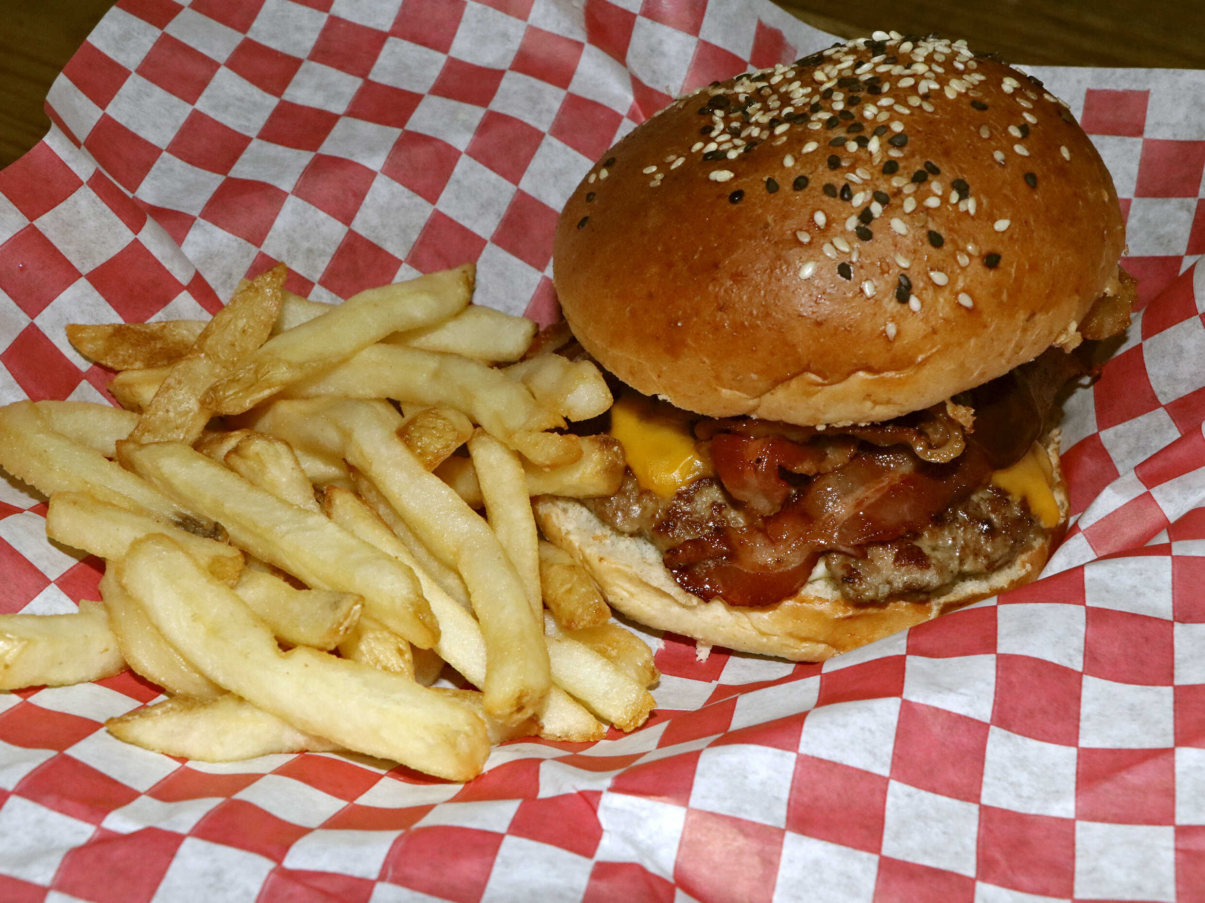Pan mediano tradicional, carne de res (150 g), queso cheddar, tocino y aros de cebolla, incluye salsa BBQ y 100 g de papas a la francesa (para una persona).