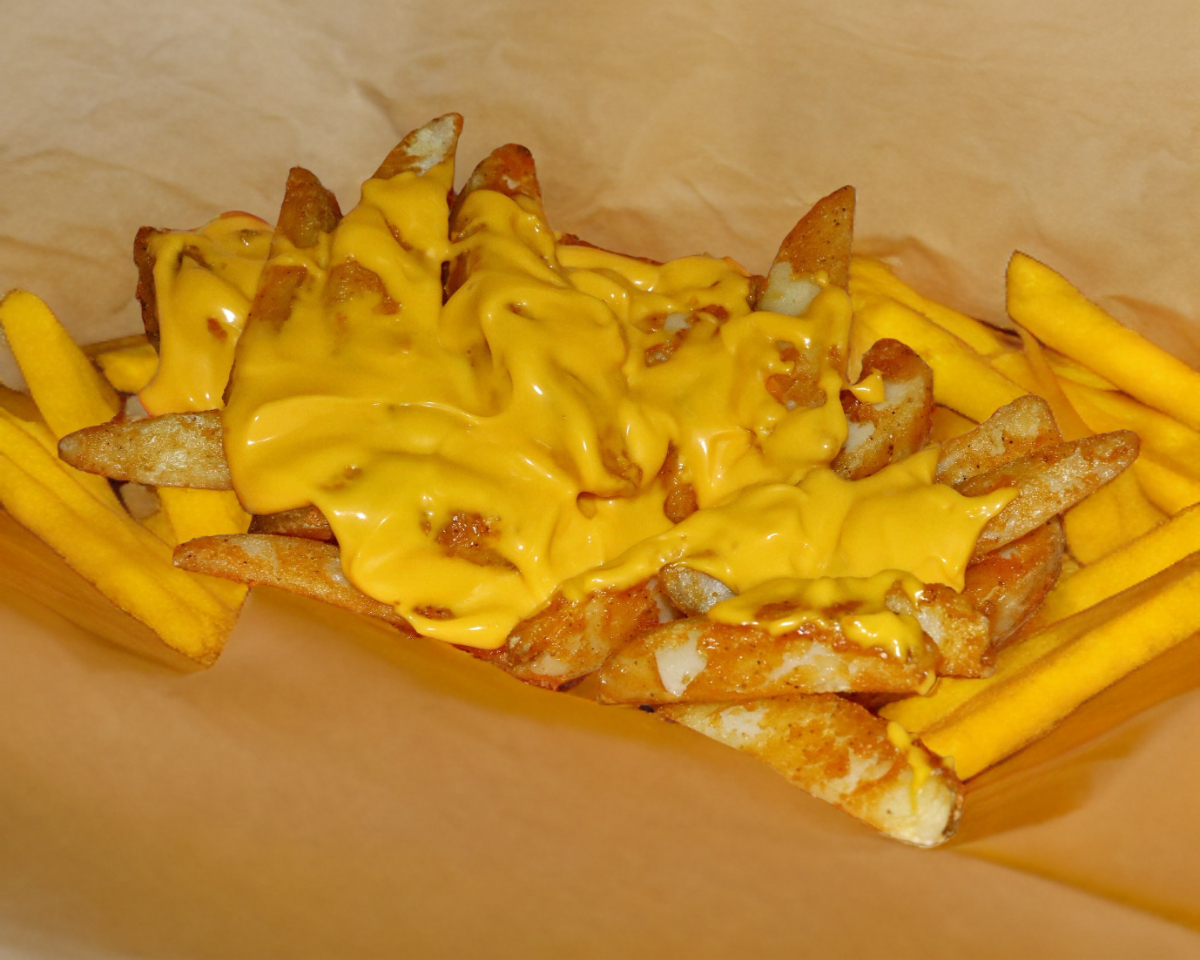 Orden de papas a la francesa con queso amarillo y kétchup.