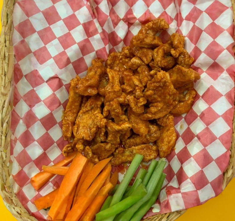 150 g De pollo empanizado, bañado en su salsa de preferencia, queso cheddar, tomate, lechuga y papas a la francesa.