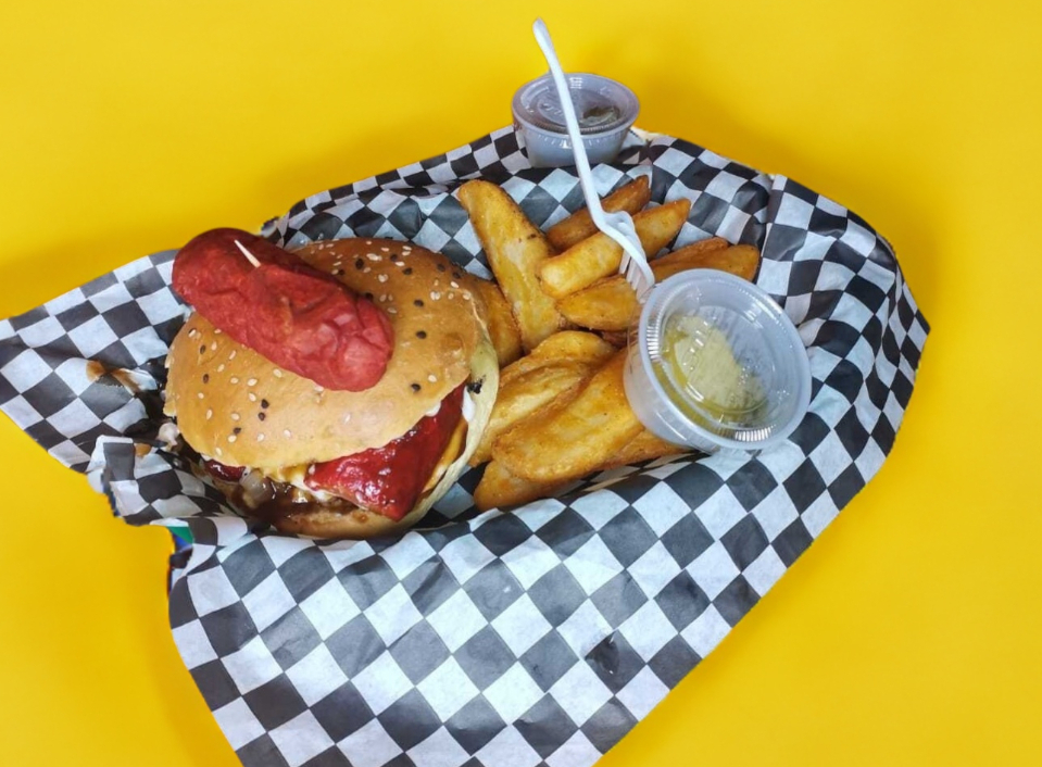 150 g De carne, queso cheddar, lechuga tomate, cebolla y papas a la francesa.
