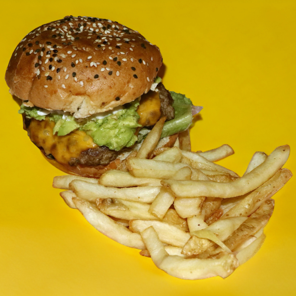 150 g De carne, queso cheddar, guacamole, tomate, lechuga y papas a la francesa.