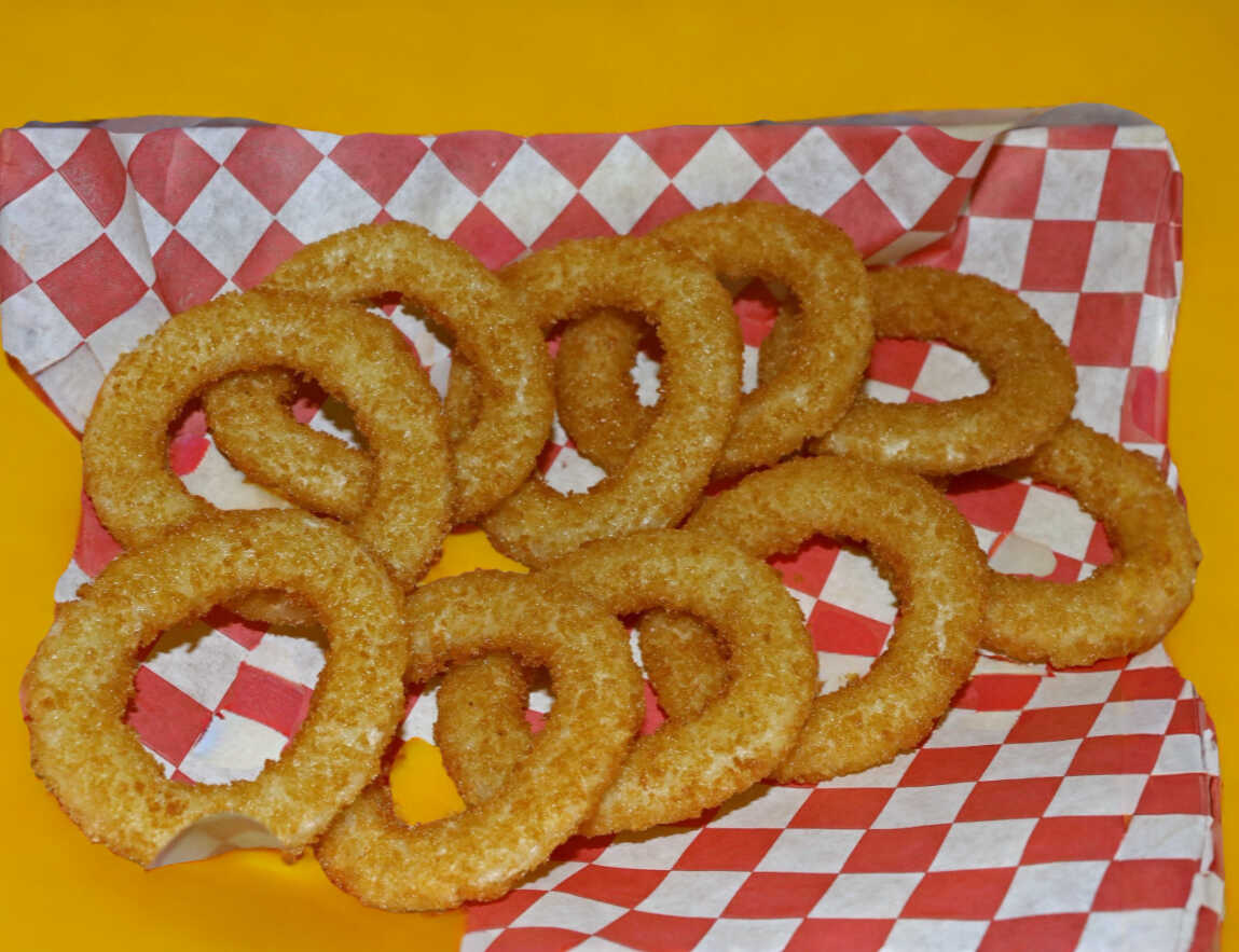 Orden de aros de cebolla acompañada de aderezo ranch y kétchup.