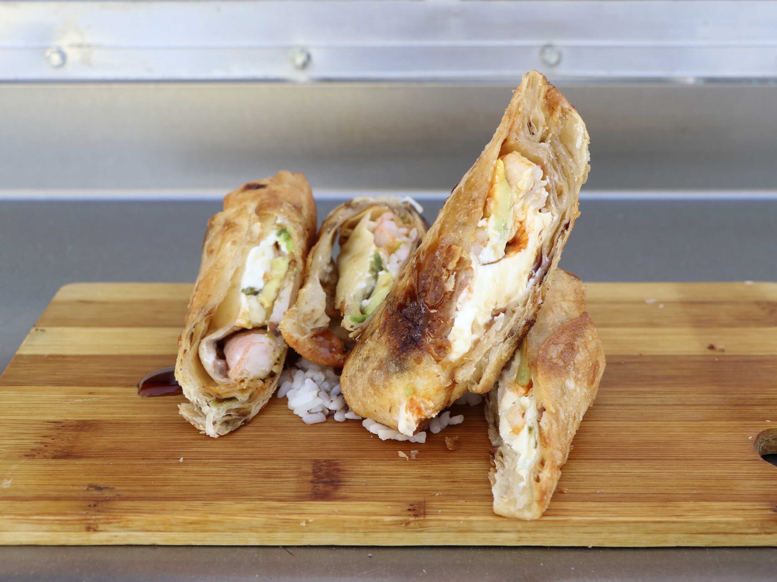 Tortilla de harina envuelta rellena de queso crema, camarón, sirasha, aguacate, barnizado con huevo, bañado en salsa de anguila.