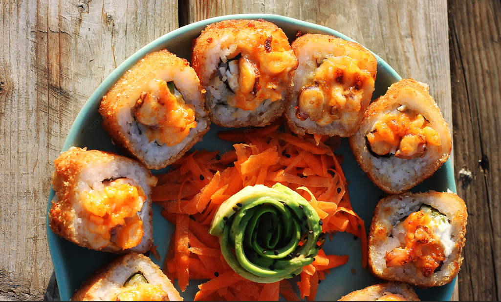 Cama de arroz empanizada arriba tampico, queso crema, aguacate, camarón empanizado bañado en salsa dulce.