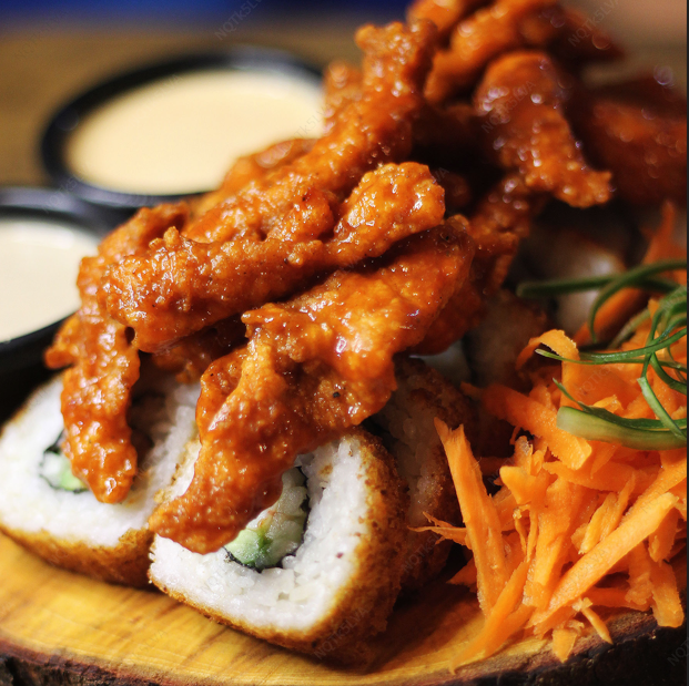 Este es un platillo personal, el cual incluye: rollo empanizado camarón ( 30 gramos de camarón), queso crema, pepino, aguacate por fuera camarón ( 30 gramos de camarón), horneado con toppings de la casa coronado con cangrejo empanizado ( 25 gramos ) bañado salsa anguila dulce., aderezo chipotle, salsa soya y zanahoria.