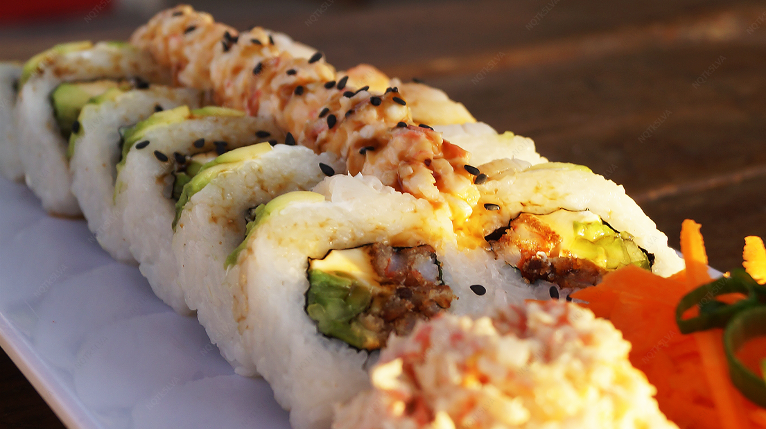 Rollo con ajonjolí por fuera, por dentro queso crema, pepino, aguacate, ingrediente a elegir cangrejo, camarón o tampico.