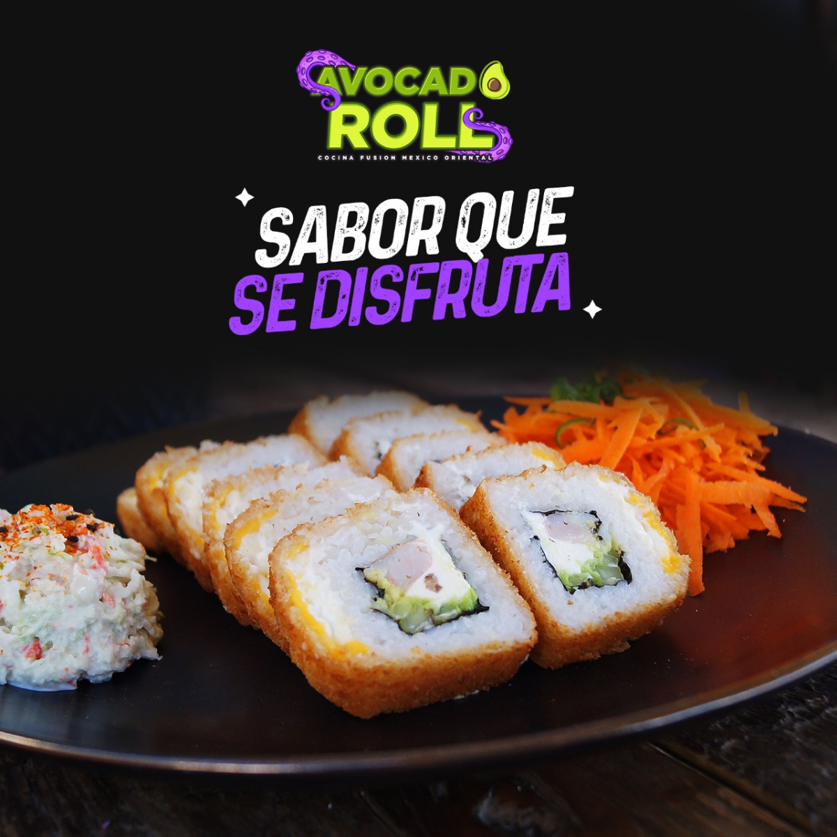 Este es un platillo personal, el cual incluye: rollo empanizado camarón ( 30 gramos de camarón), queso crema, pepino, aguacate por fuera camarón ( 30 gramos de camarón), horneado con toppings de la casa coronado con cangrejo empanizado ( 25 gramos ) bañado salsa anguila dulce., aderezo chipotle, salsa soya y zanahoria.