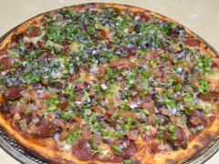 170 g de carne sazonada, champiñones salteados, cebolla asada, salsa de tomate, aderezo chipotle, chile verde tatemado, peperoni, aceitunas negras, queso chihuahua y catsup