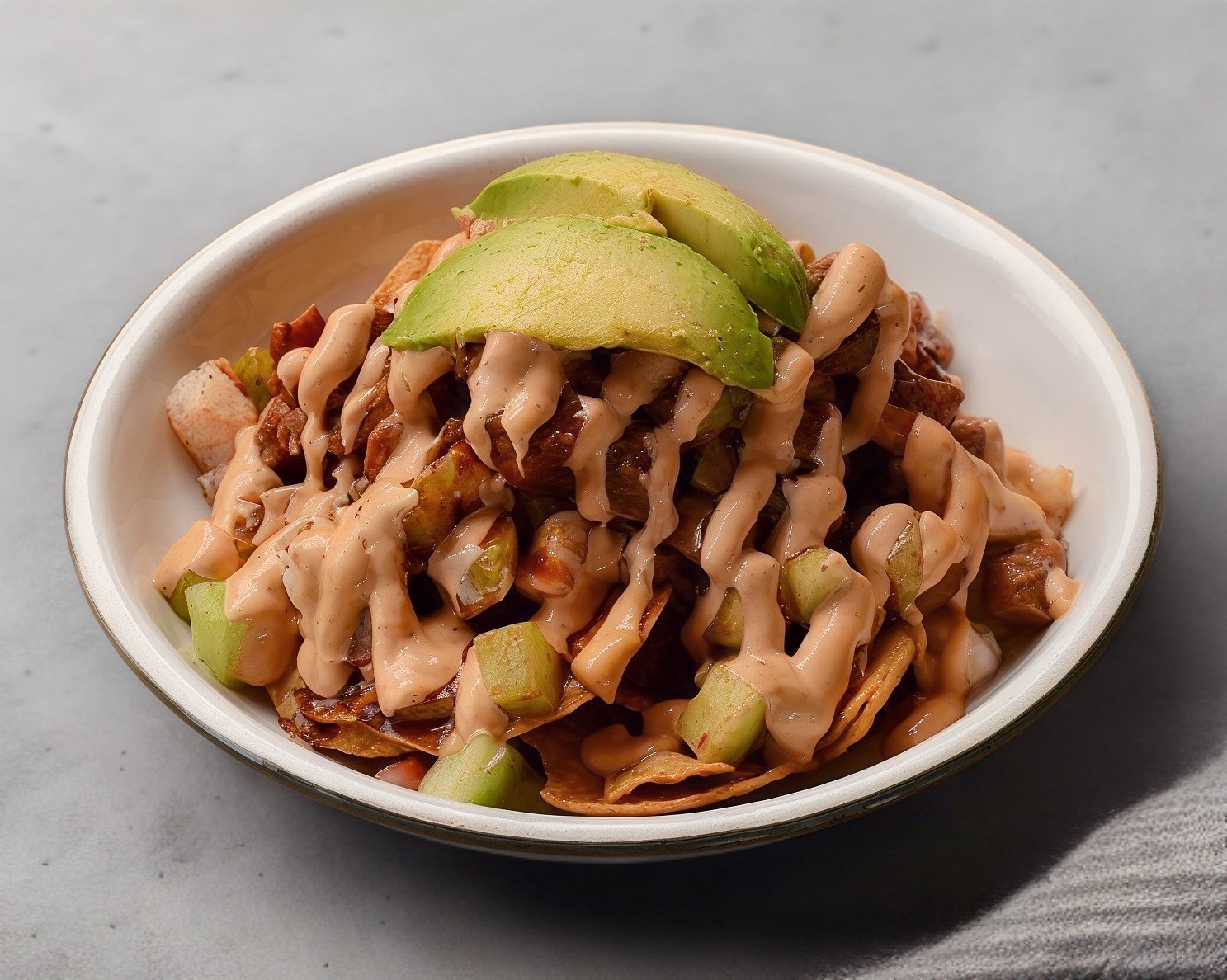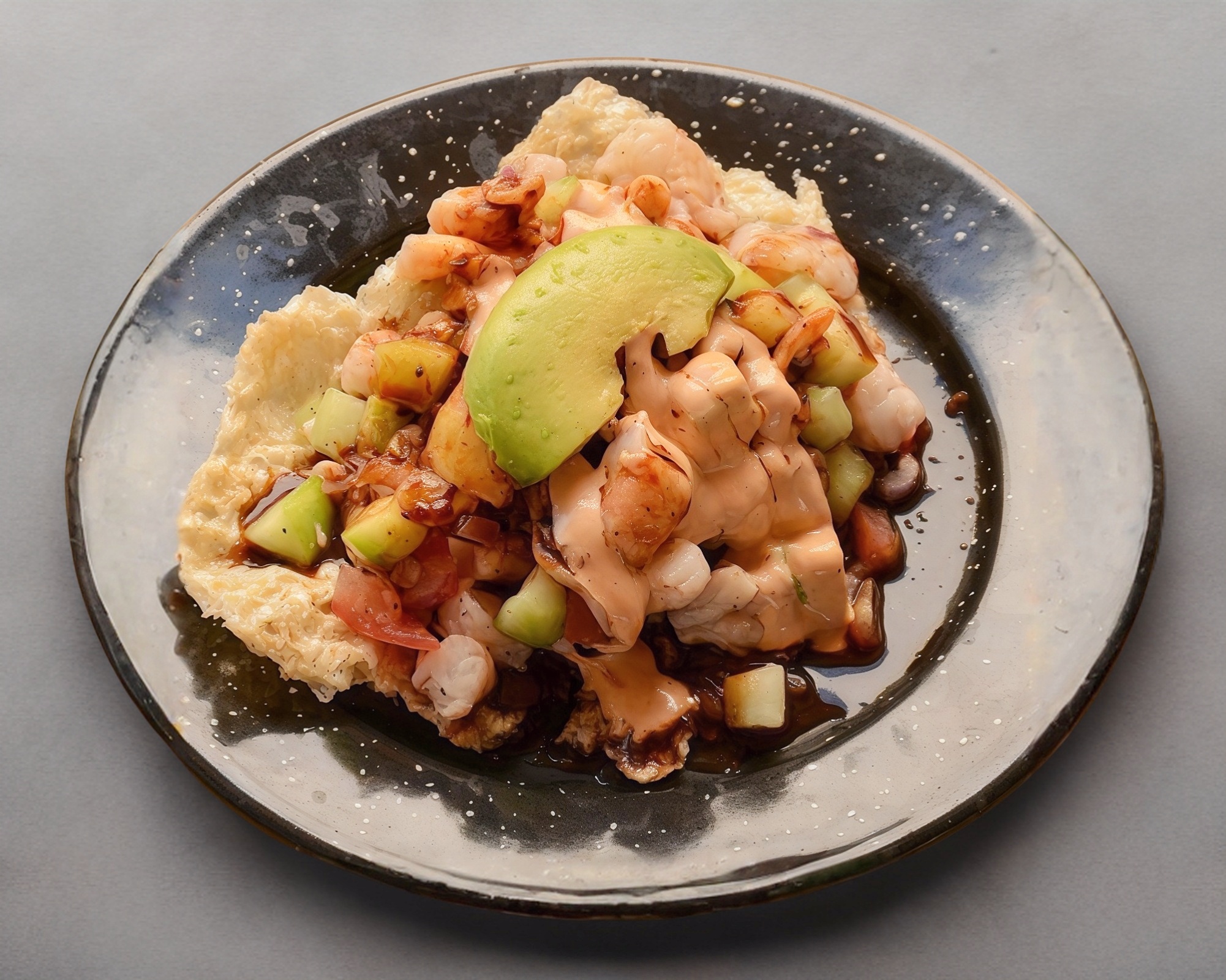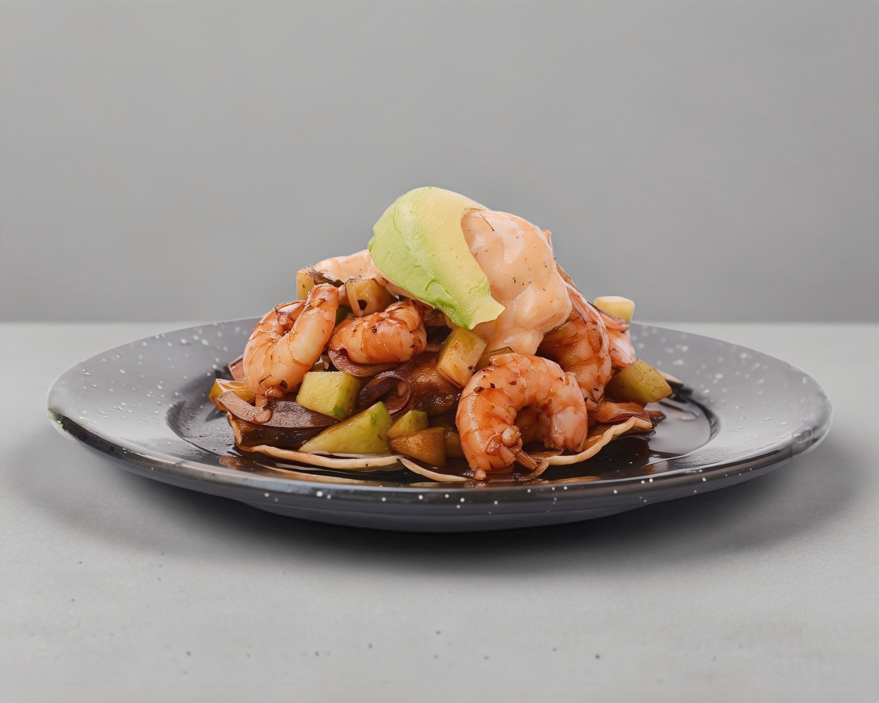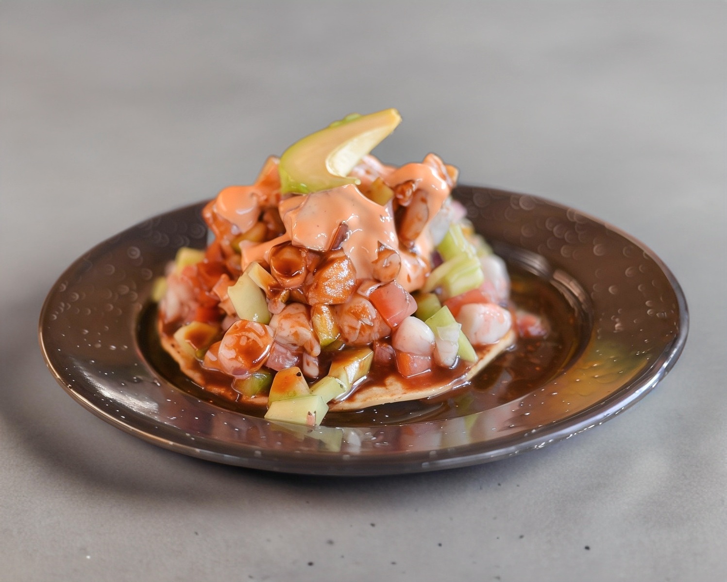 Sobre una base de alioli chipotle, ceviche de camarón, salsa 7 mares y aguacate.