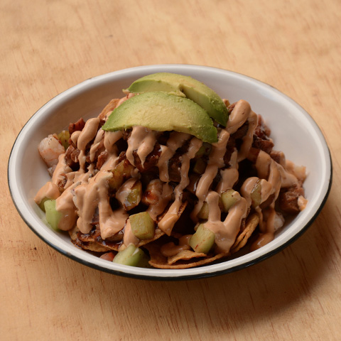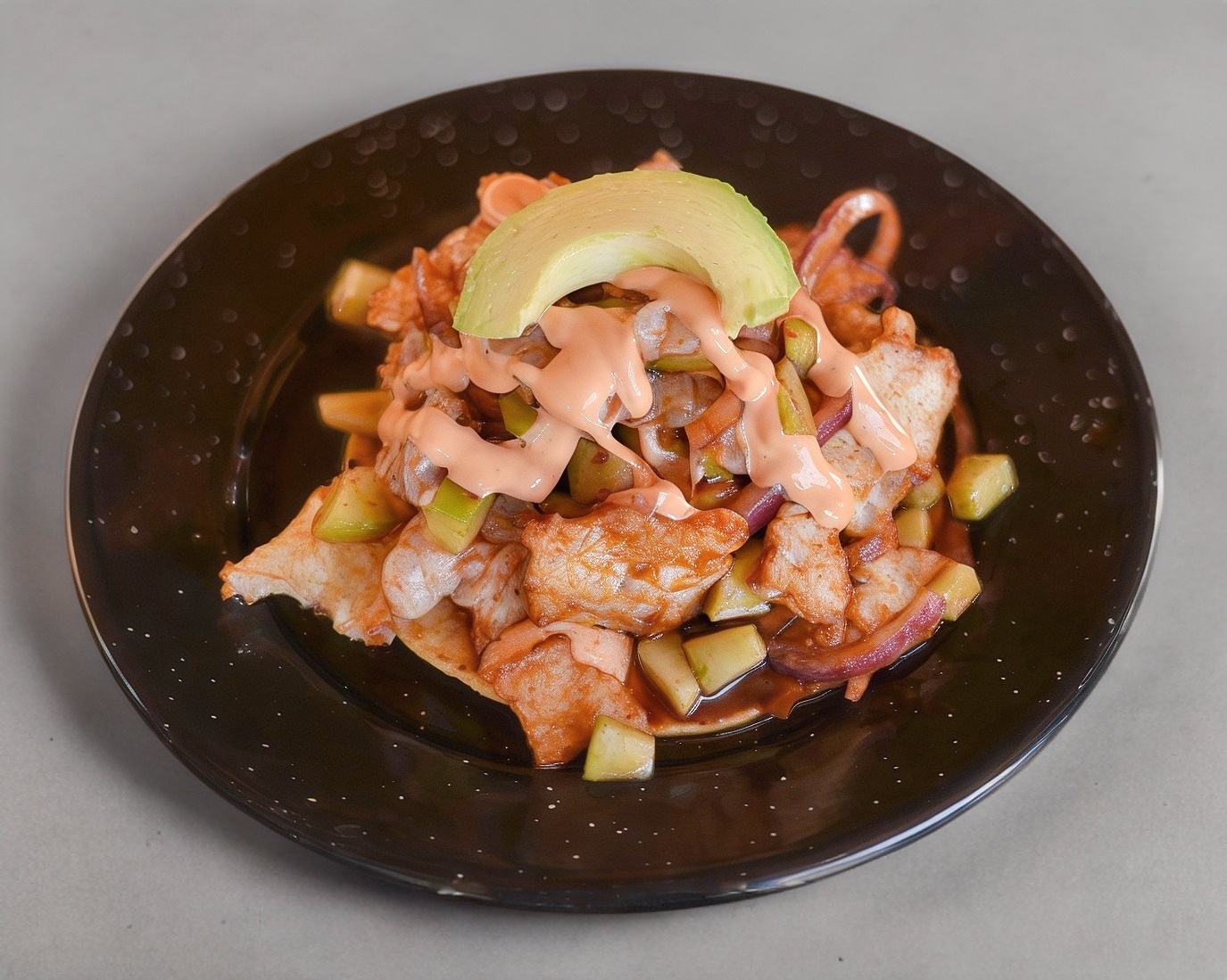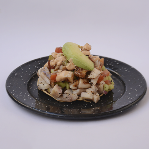 Sobre una base de alioli chipotle, camarón en aguachile, cebolla morada, salsa 7 chiles, aguacate, pepino y chicharrón.