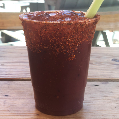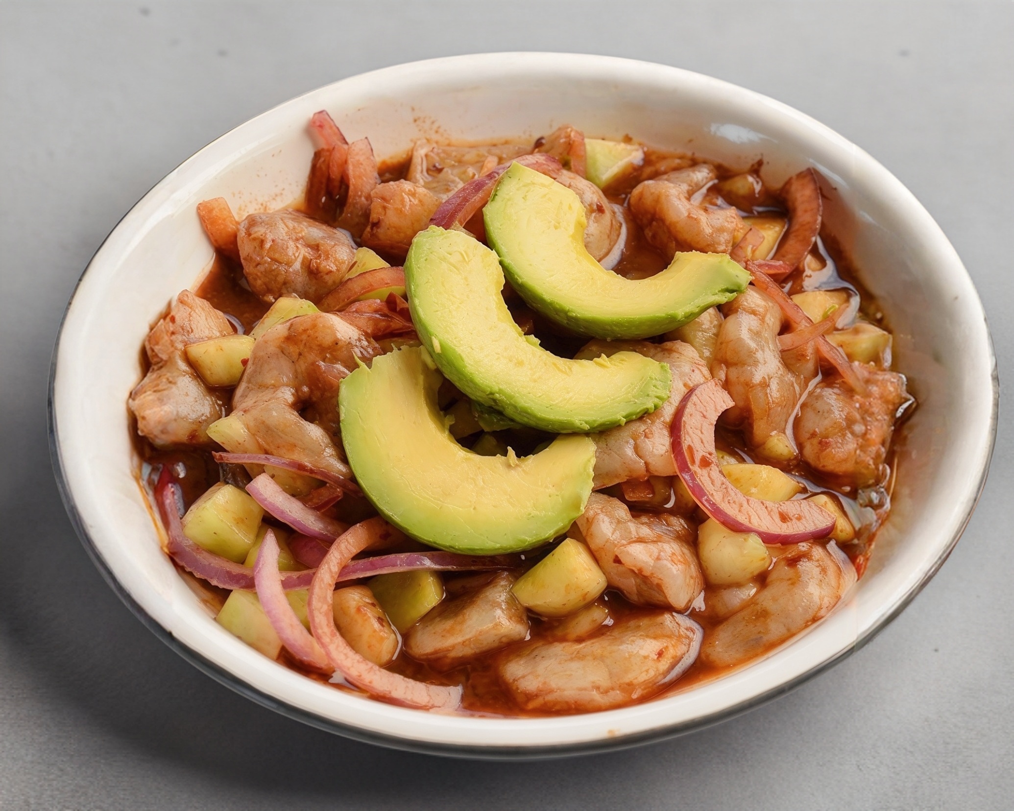 Camarón, salsa 7 chiles, limón, pepino, aguacate y cebolla morada.