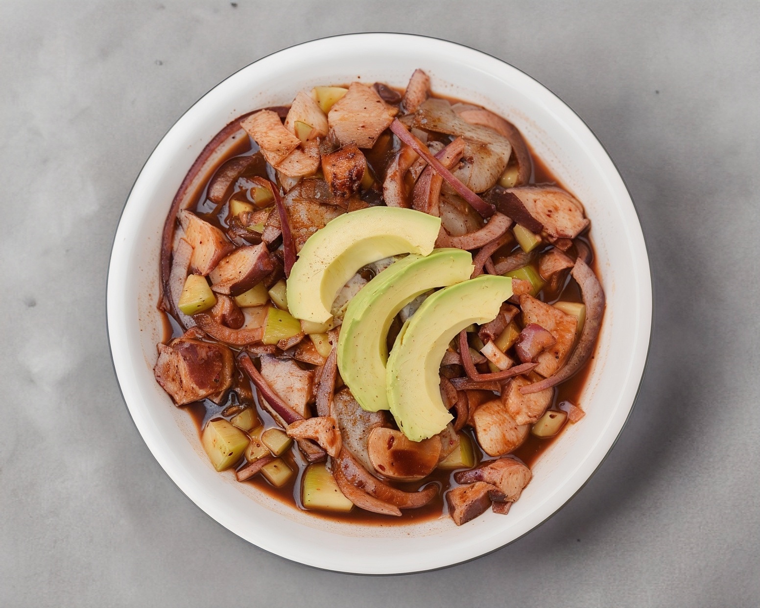 Aguacate, cebolla morada, limón, chiltepín y chicharrón.