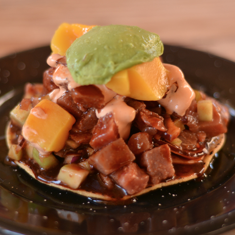 Sobre una base de alioli chipotle, atún marinado en salsas negras y aguacate.
