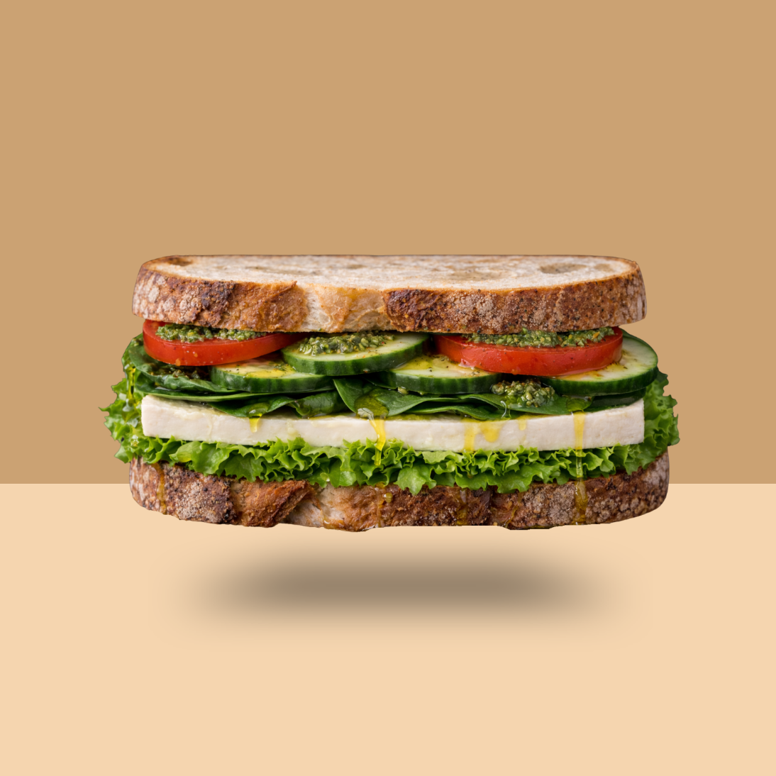 Pan de masa madre con queso panela, pepino, lechuga fresca, tomate, pesto y aceite de oliva.