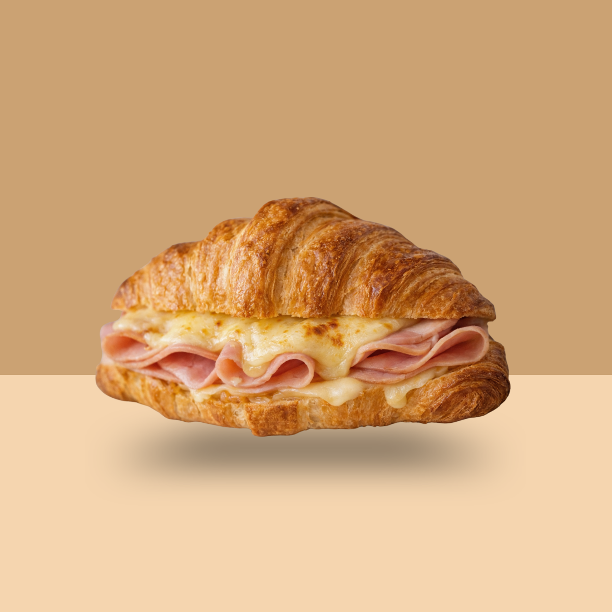 Croissant hojaldrado con jamón y queso derretido, dorado al momento.
