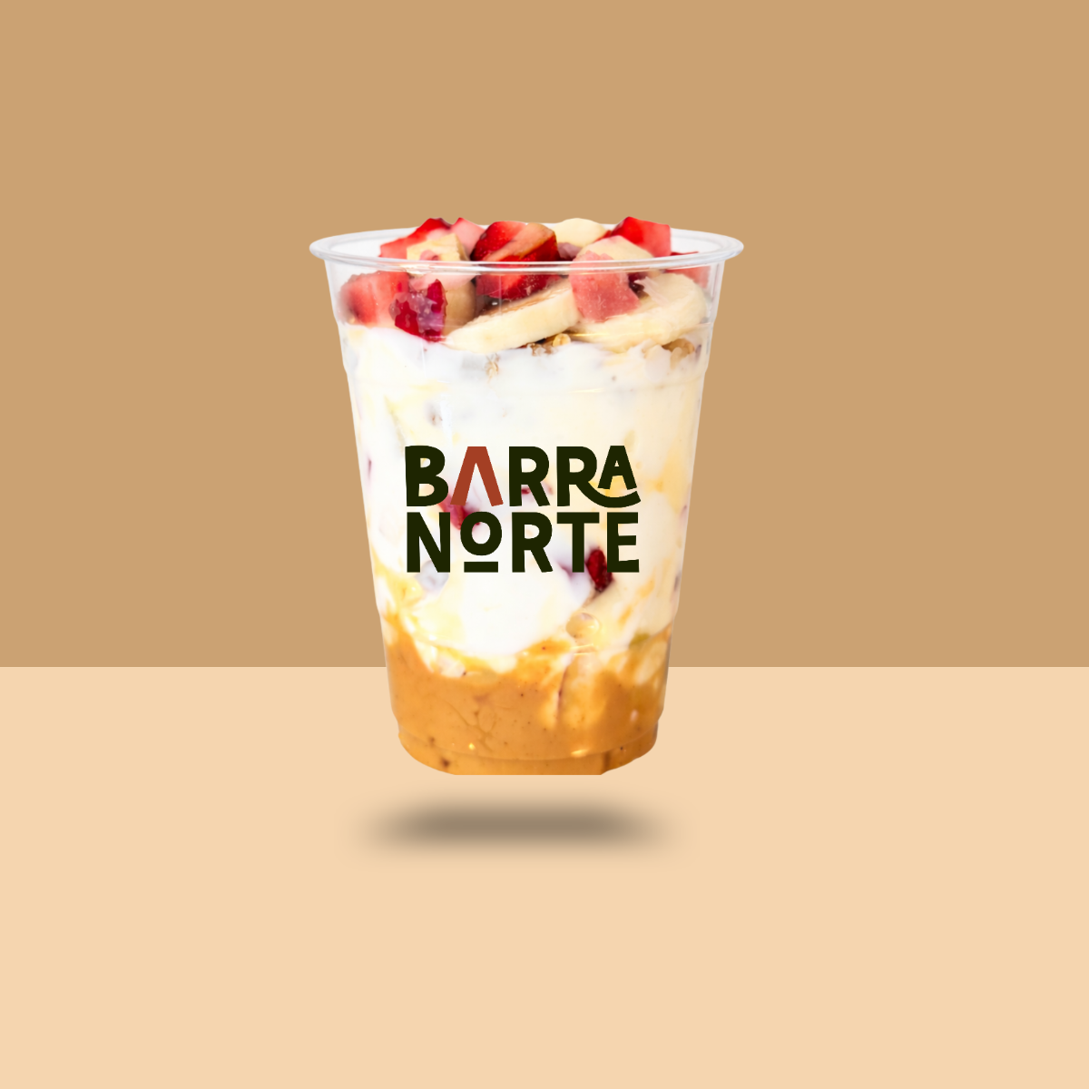 Yogurt griego con fruta fresca, granola crujiente, miel y mantequilla de maní.
