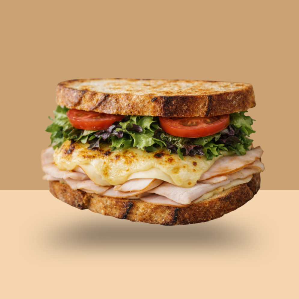 Pan de masa madre con pavo, doble queso, lechugas frescas, tomate y pesto con chipotle de la casa.